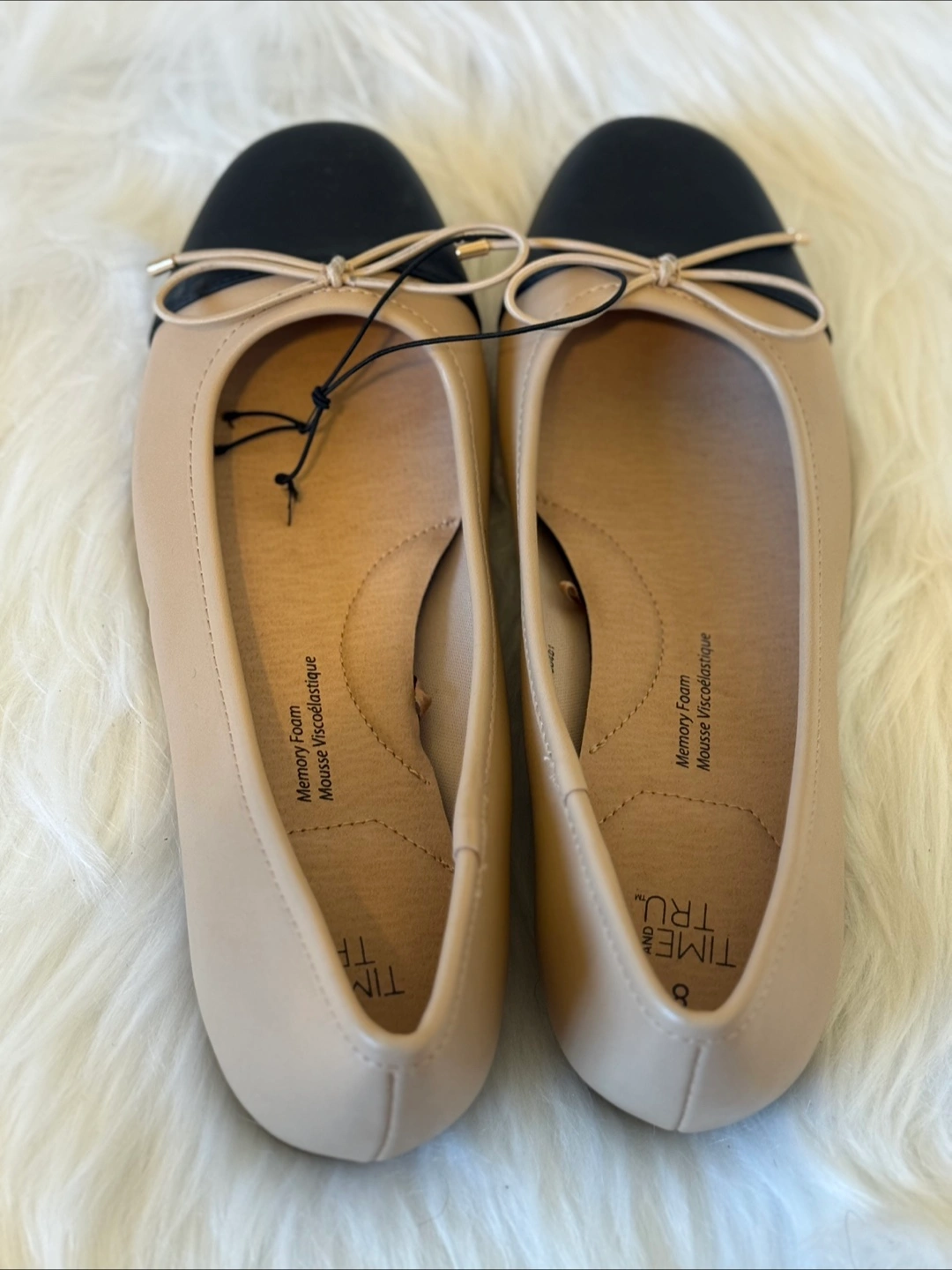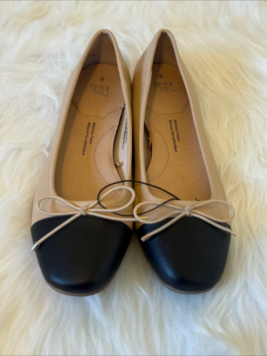 Cute Time and Tru ballet flats in size 8! They're a stylish beige and black colour-block design. The insoles have memory foam so they're super comfy!