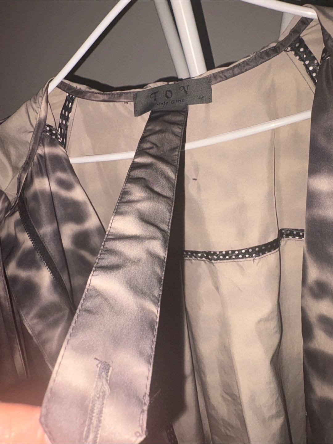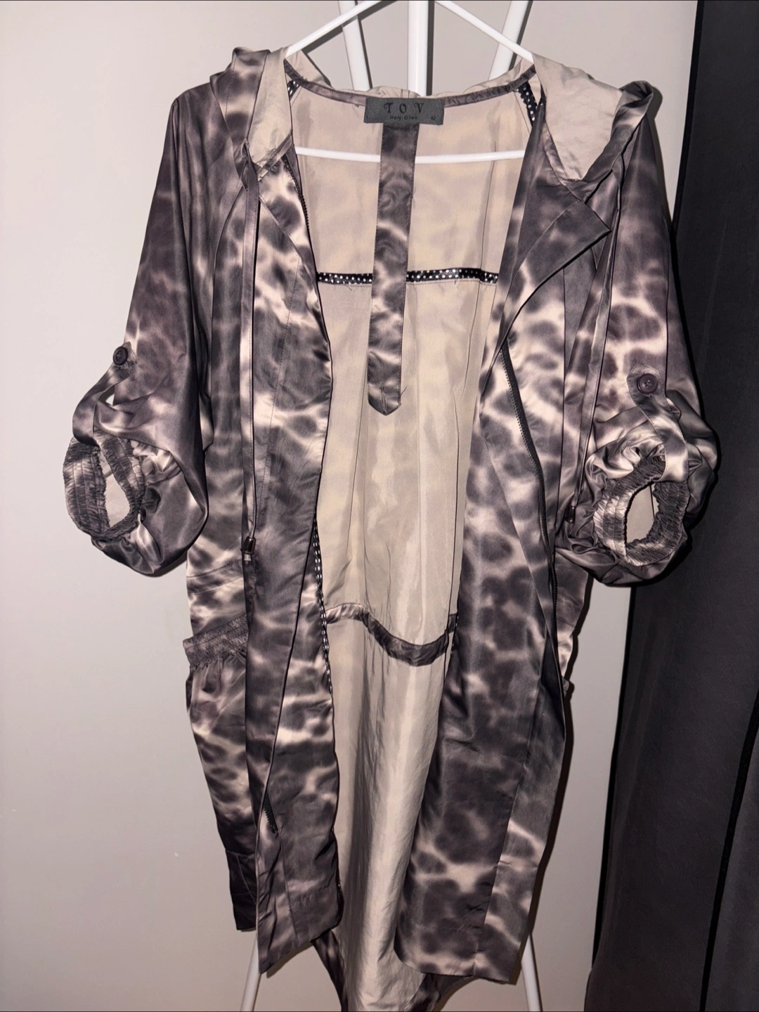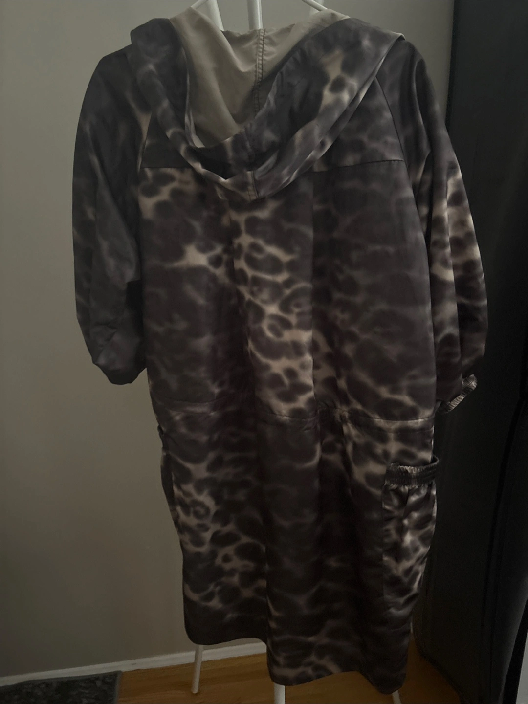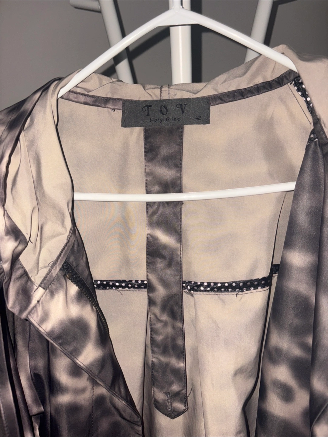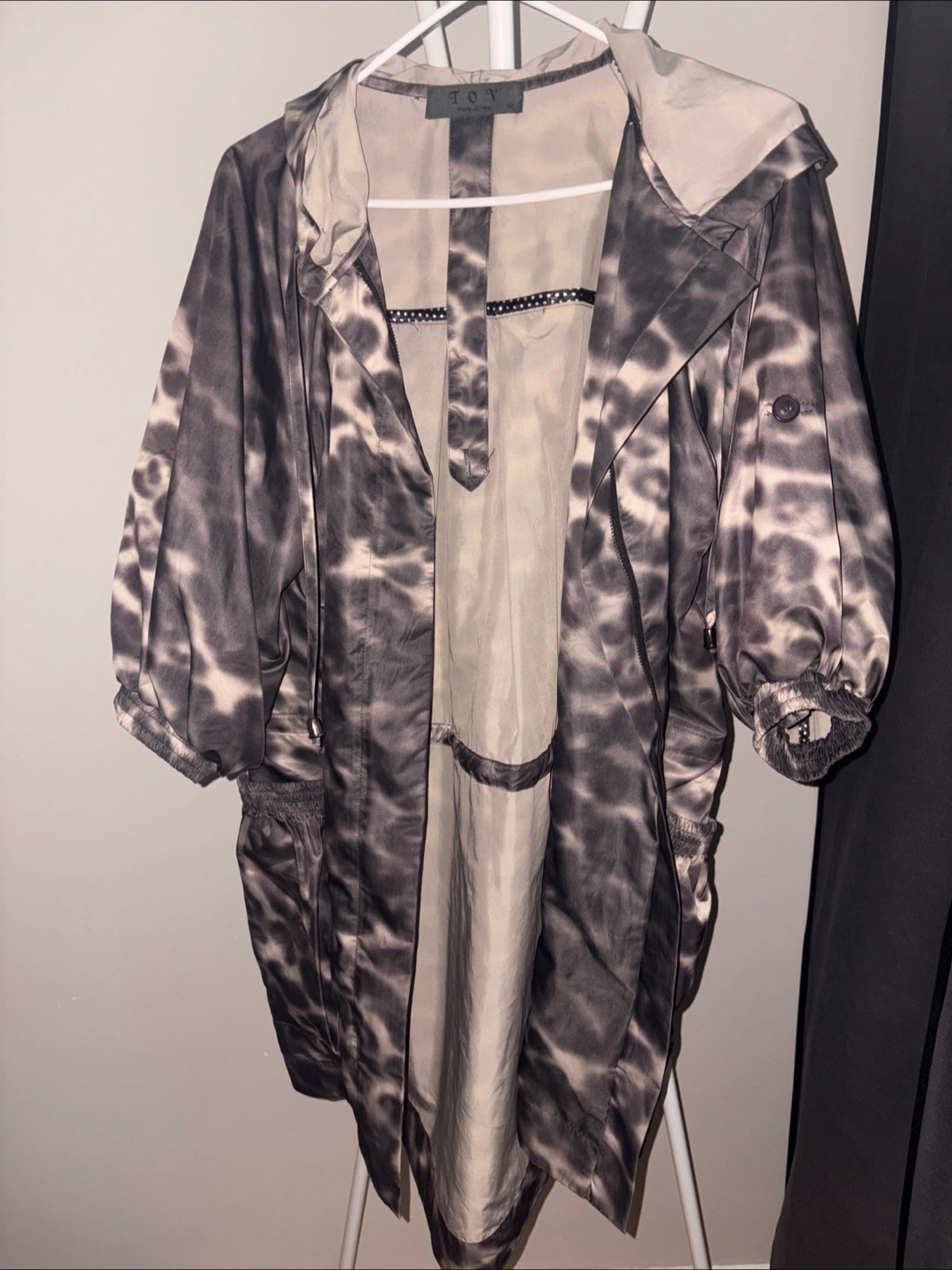 Selling a TOV Holy Gino coat in size 42. It features a stylish grey and beige pattern with two front pockets. It has a hood for extra coziness on those chilly days. The hood can be buttoned away. Also the sleeves can be buttoned shorter. It’s perfect for adding a unique touch to your wardrobe!
