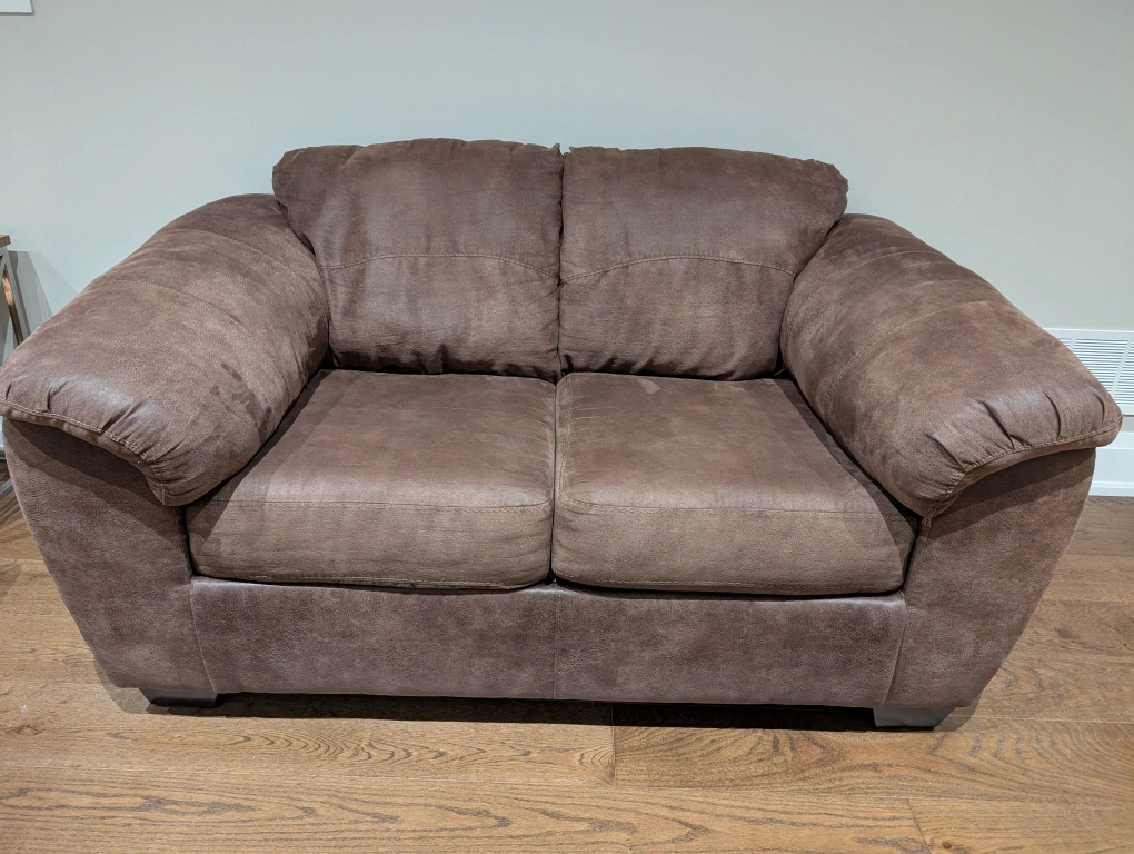 Selling an Ashley Furniture Loveseat in a coffee colour and soft faux suede material. It's a cozy and comfortable loveseat that's perfect for smaller spaces. It's in good condition and ready for a new home.