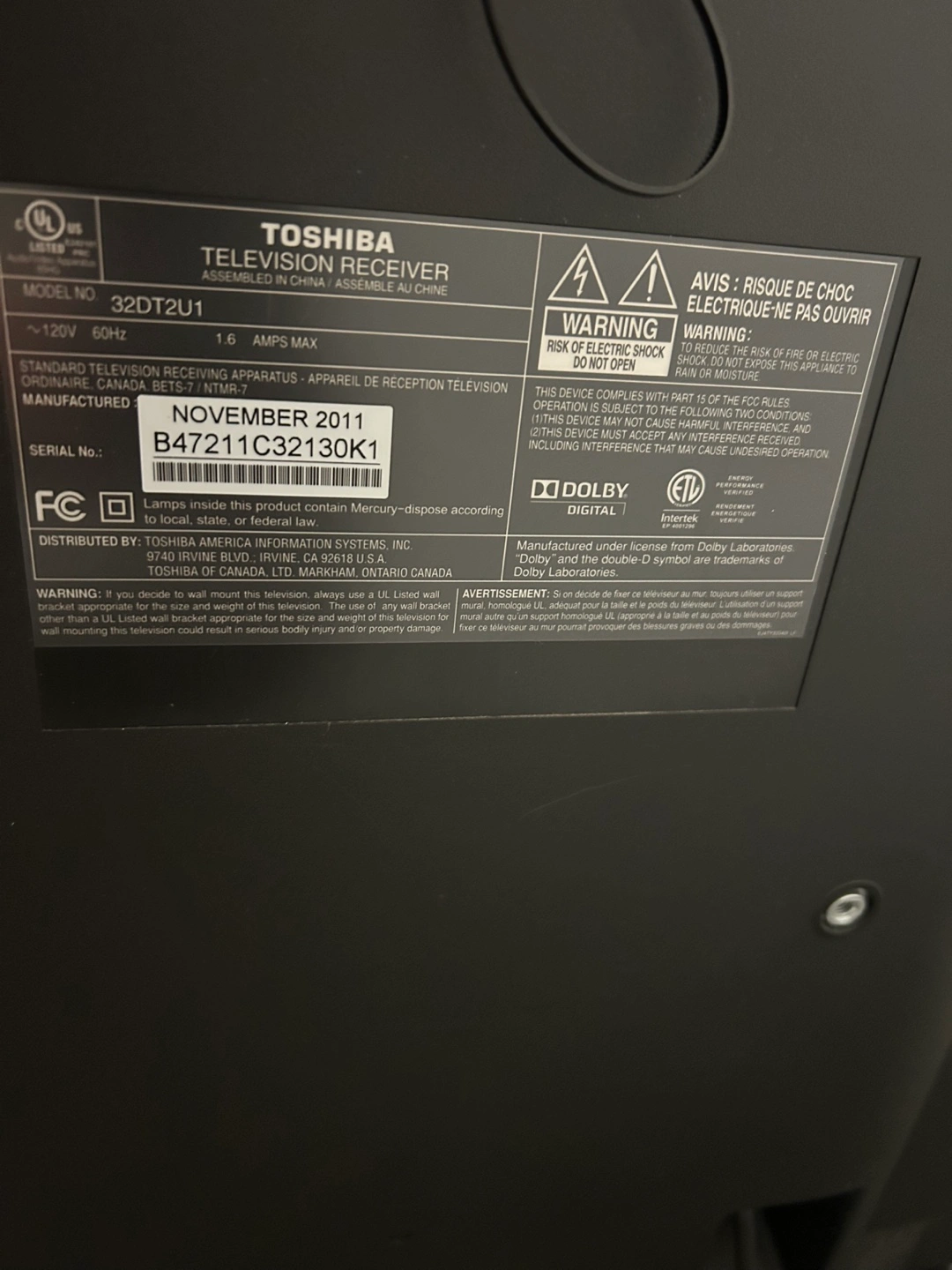 Selling a Toshiba television 32” hd, model number 32DT2U1. It's in good working condition and ready for a new home No remote