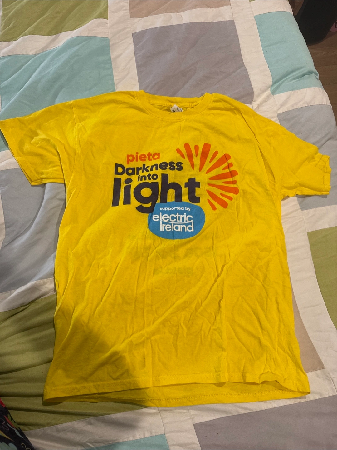 Selling a yellow t-shirt with the 'Pieta Darkness into Light' design. It's in BRAND NEW and features the Electric Ireland logo. A great way to show your support! Size: medium.