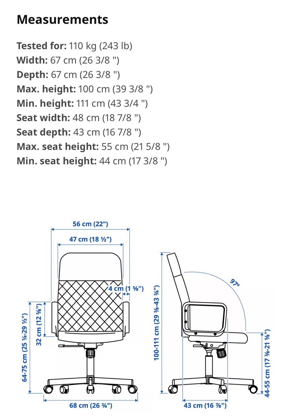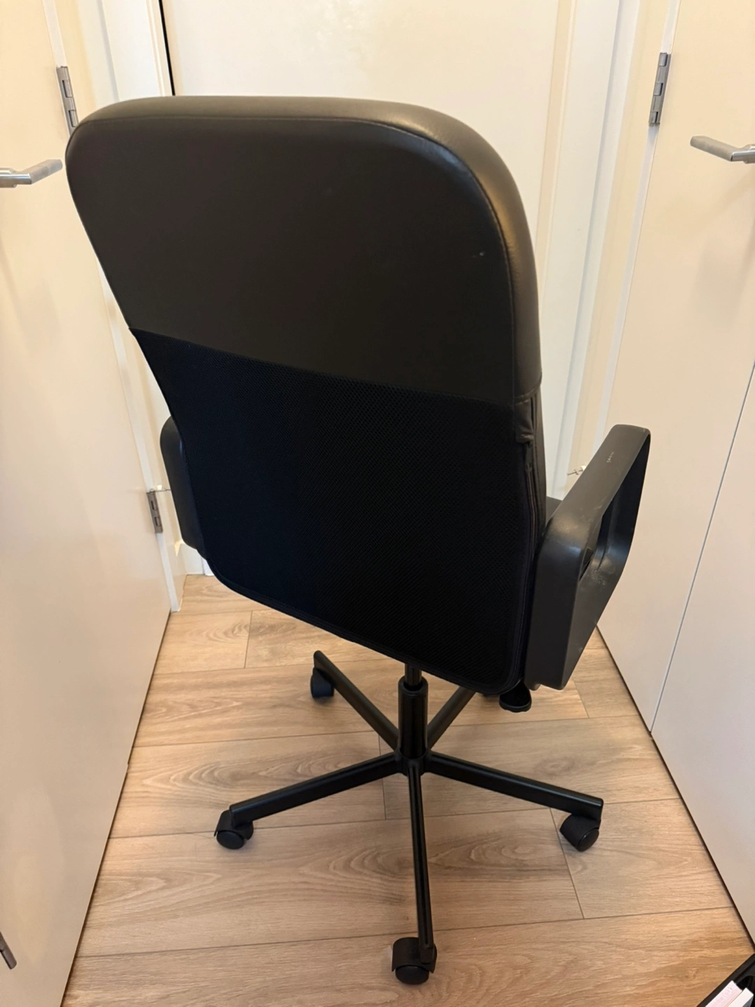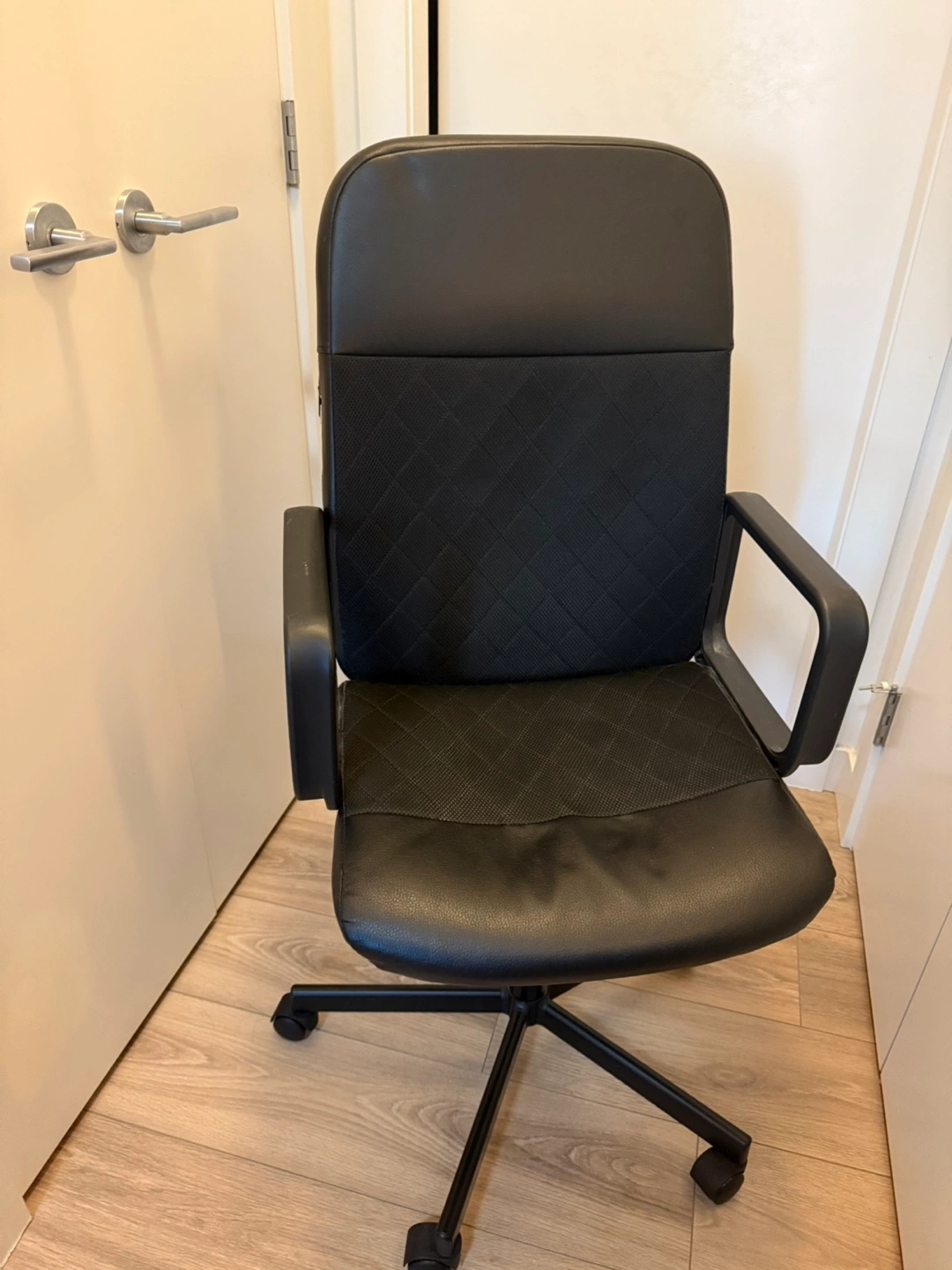 Moving sale Nice and clean office chair Ready to use Cash and in person pick up only Selling a used IKEA Markus office chair in black. It's in good condition and perfect for a home office or study space. The chair is comfortable and provides good support for long hours of work or gaming. It has adjustable height and tilt functions.