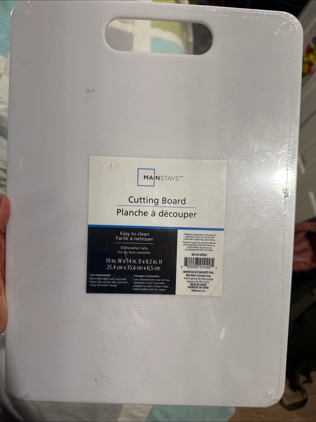 Selling a BRAND NEW Mainstays cutting board! It's dishwasher safe and easy to clean. The dimensions are 10 inches wide x 14 inches deep x 0.2 inches high (25.4 cm x 35.6 cm x 0.5 cm).