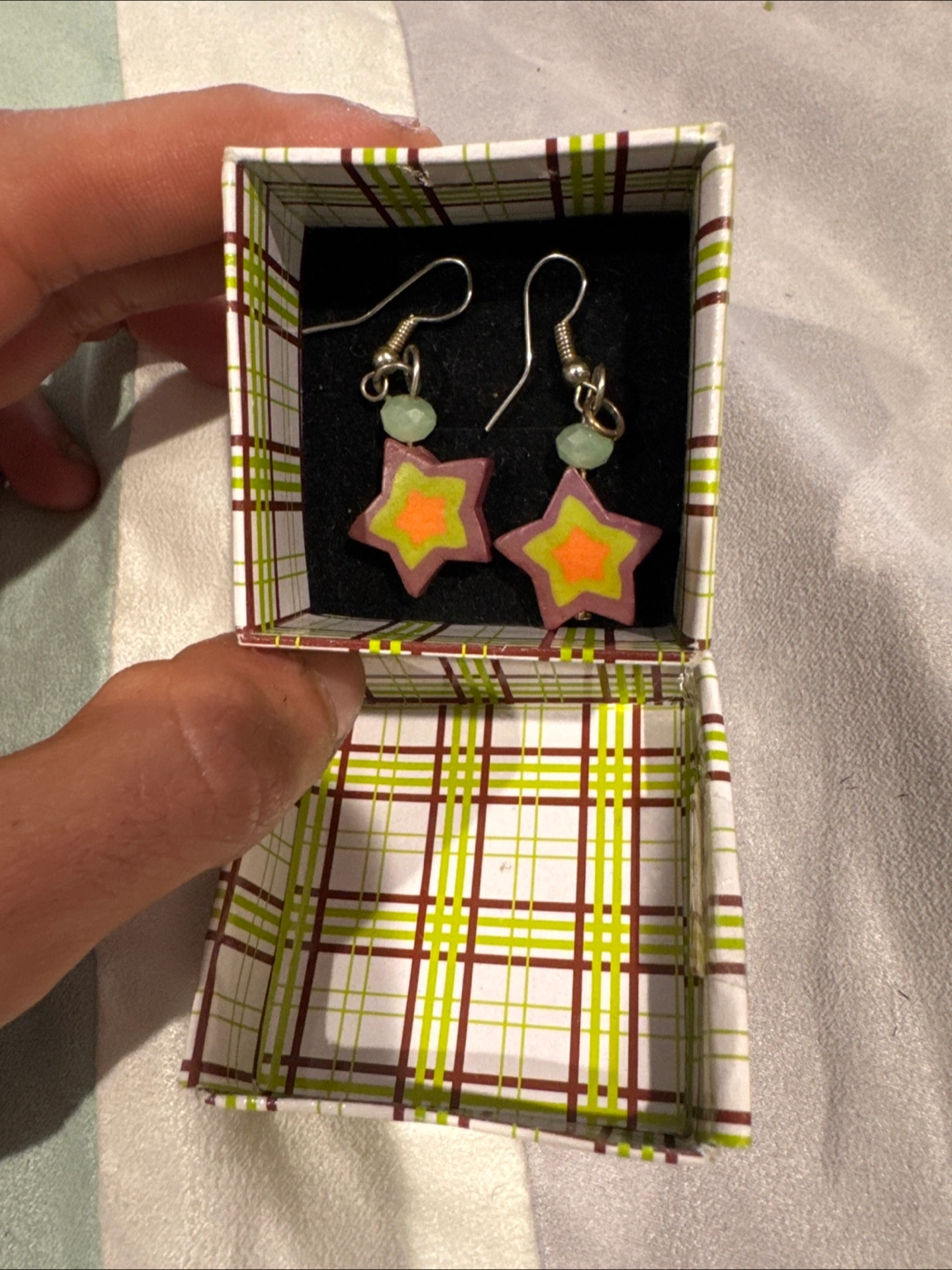 Cute star-shaped earrings in a fun, colourful design! They come in a matching plaid box, perfect for gifting or keeping them safe. These earrings are sure to add a little sparkle to your day