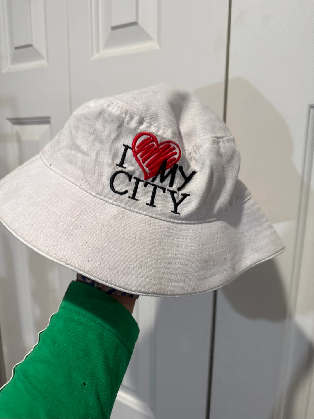 Selling a white bucket hat with the words "I ❤️ My City" embroidered on the front. It's in great condition and perfect for adding a bit of fun to your outfit!