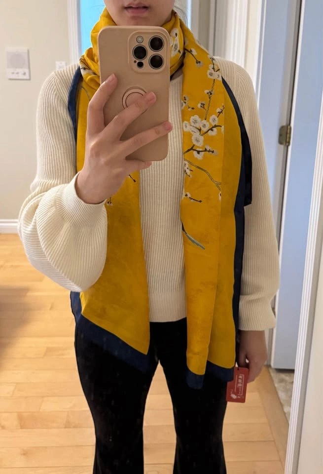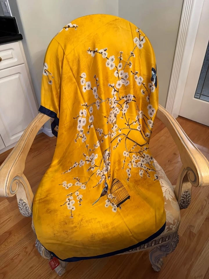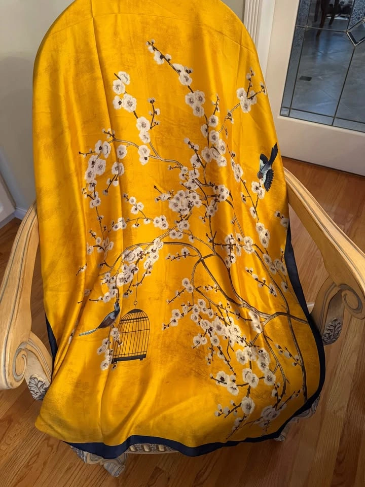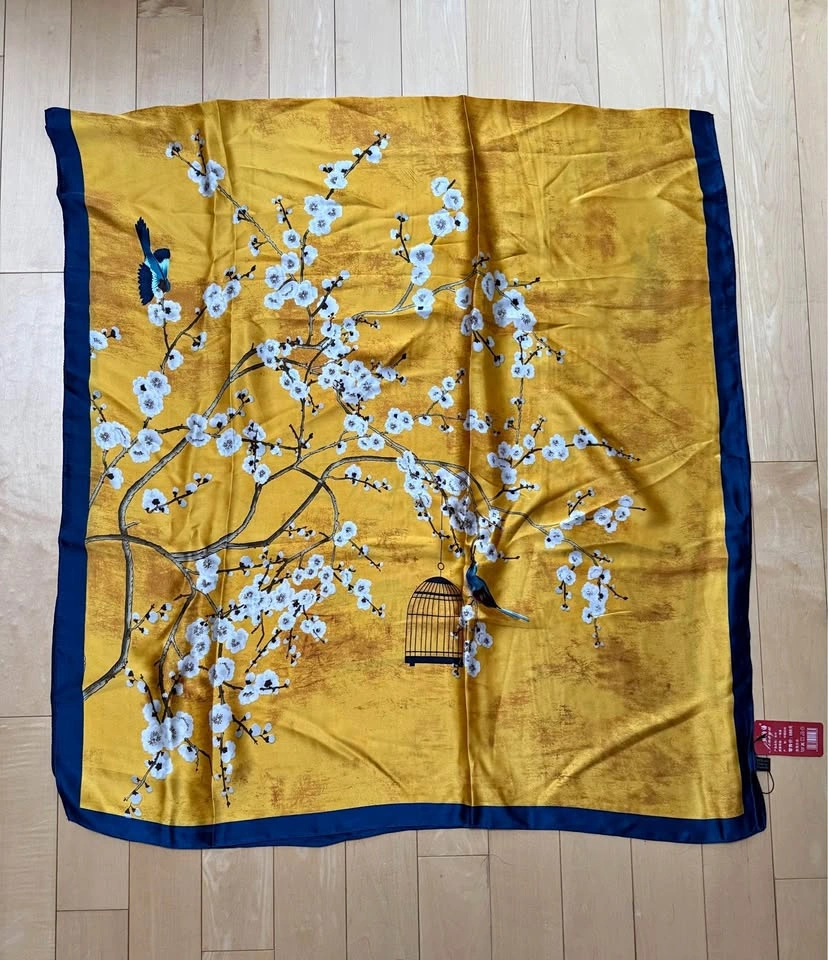 BRAND NEW Yellow Blue Silk-like Bird & Flower Patterned Scarf / Wraparound Comes in original packaging Has a shiny, smooth texture and is very elegant Polyester material 34” w x 71” l Selling some other scarves as well. See profile for more Pick-up near Oakridge Centre