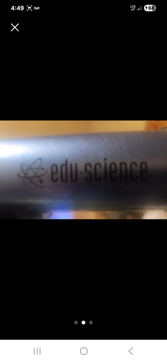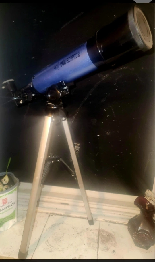 Giving an Edu-Science telescope. It has a 50mm objective lens and comes with a tripod. Perfect for beginners interested in astronomy. might be missing main Lens to it. could buy new lens, or used this telescope as a parts and the blue a new lens or card.