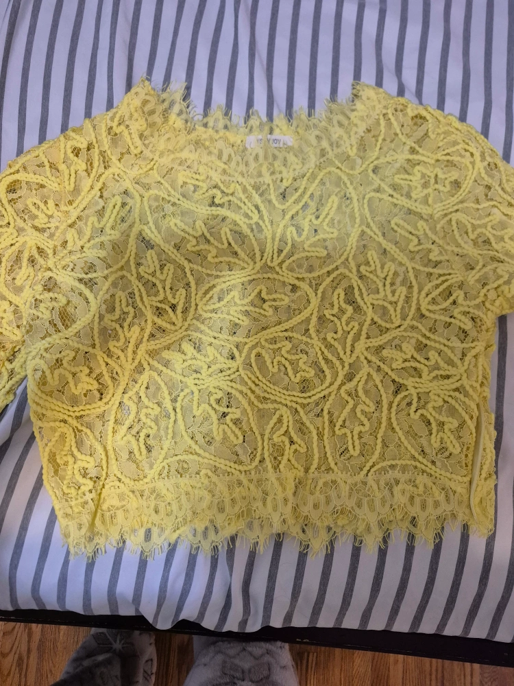 Here's a cute yellow lace top from San Joy! It's perfect for adding a pop of colour to your wardrobe. The lace detailing is really pretty and adds a touch of elegance
