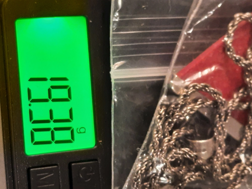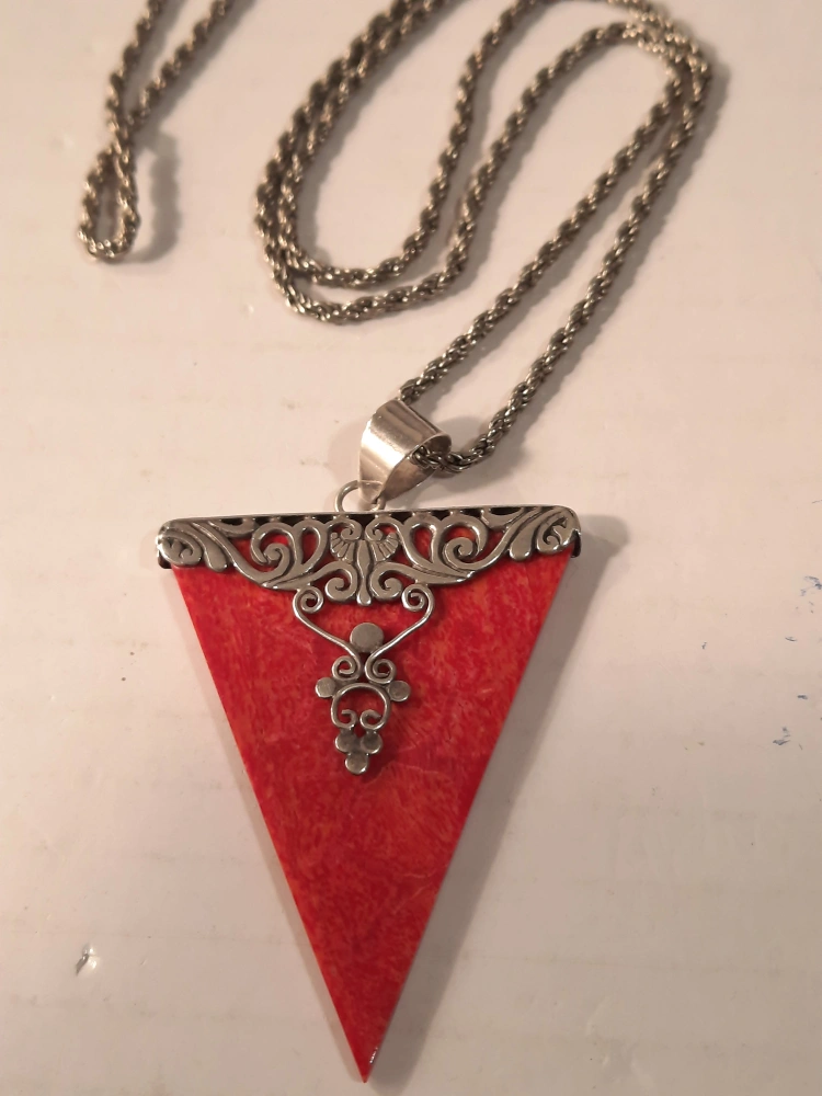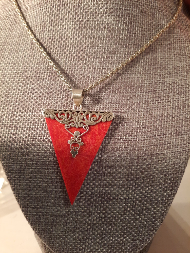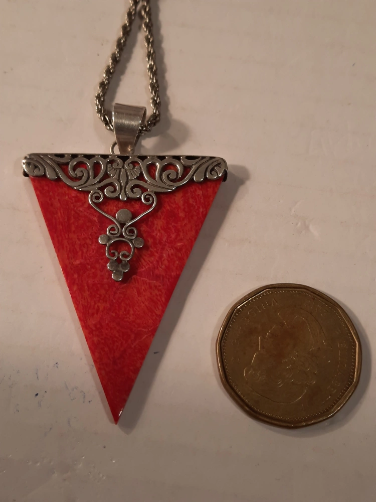 This is a unique red triangle pendant necklace. The pendant has silver-925 stamp and a decorative design. It's a lovely piece to add a pop of colour to any outfit! good condition. pick up oshawa