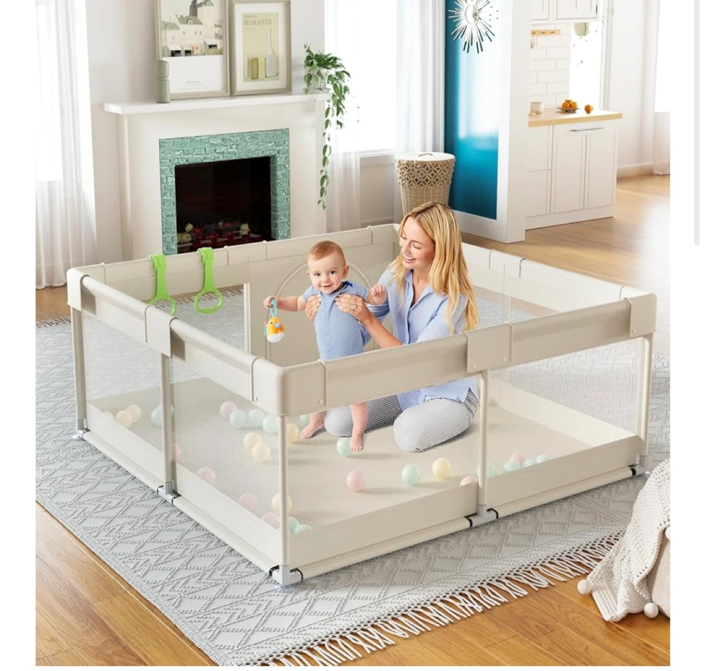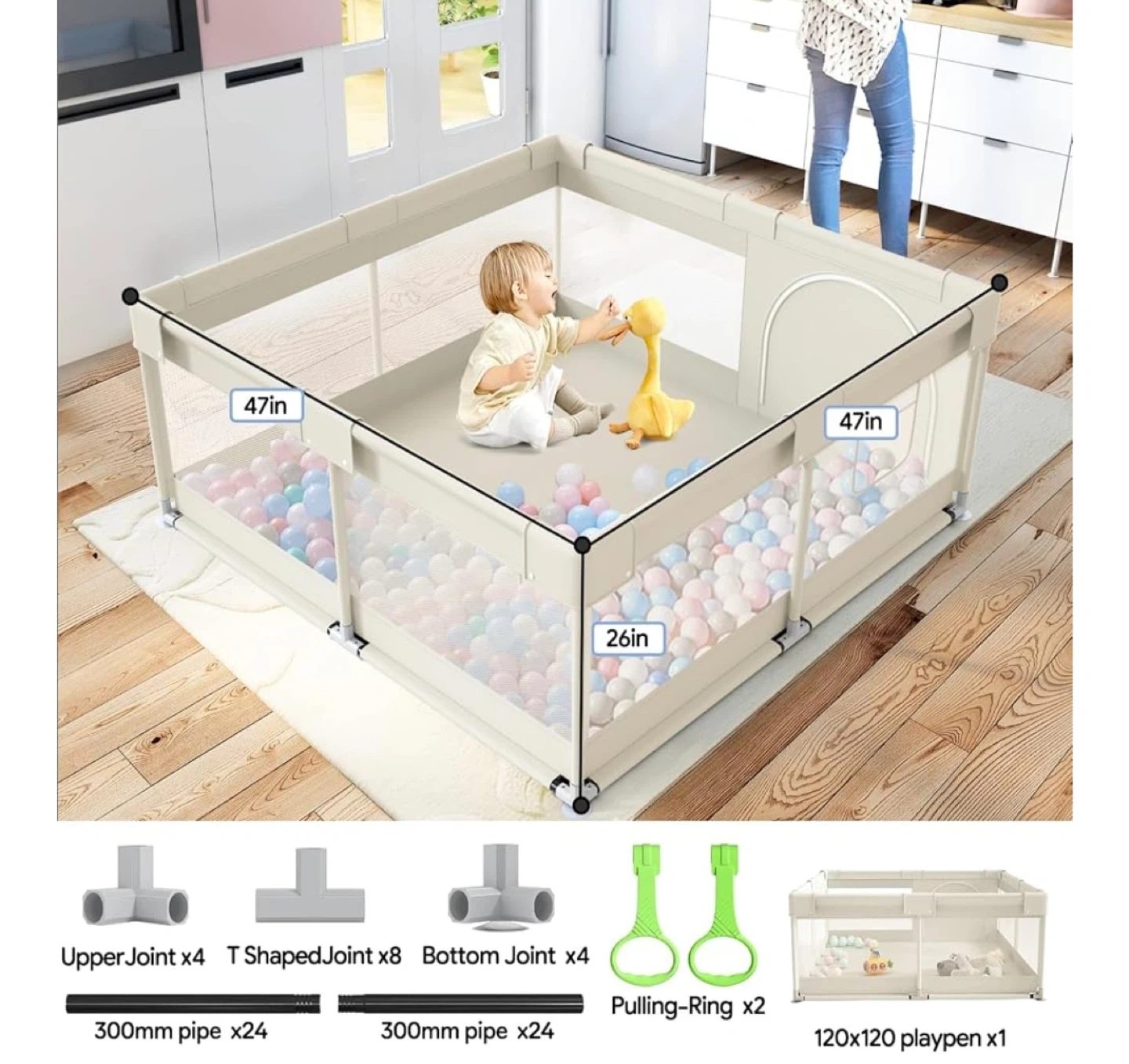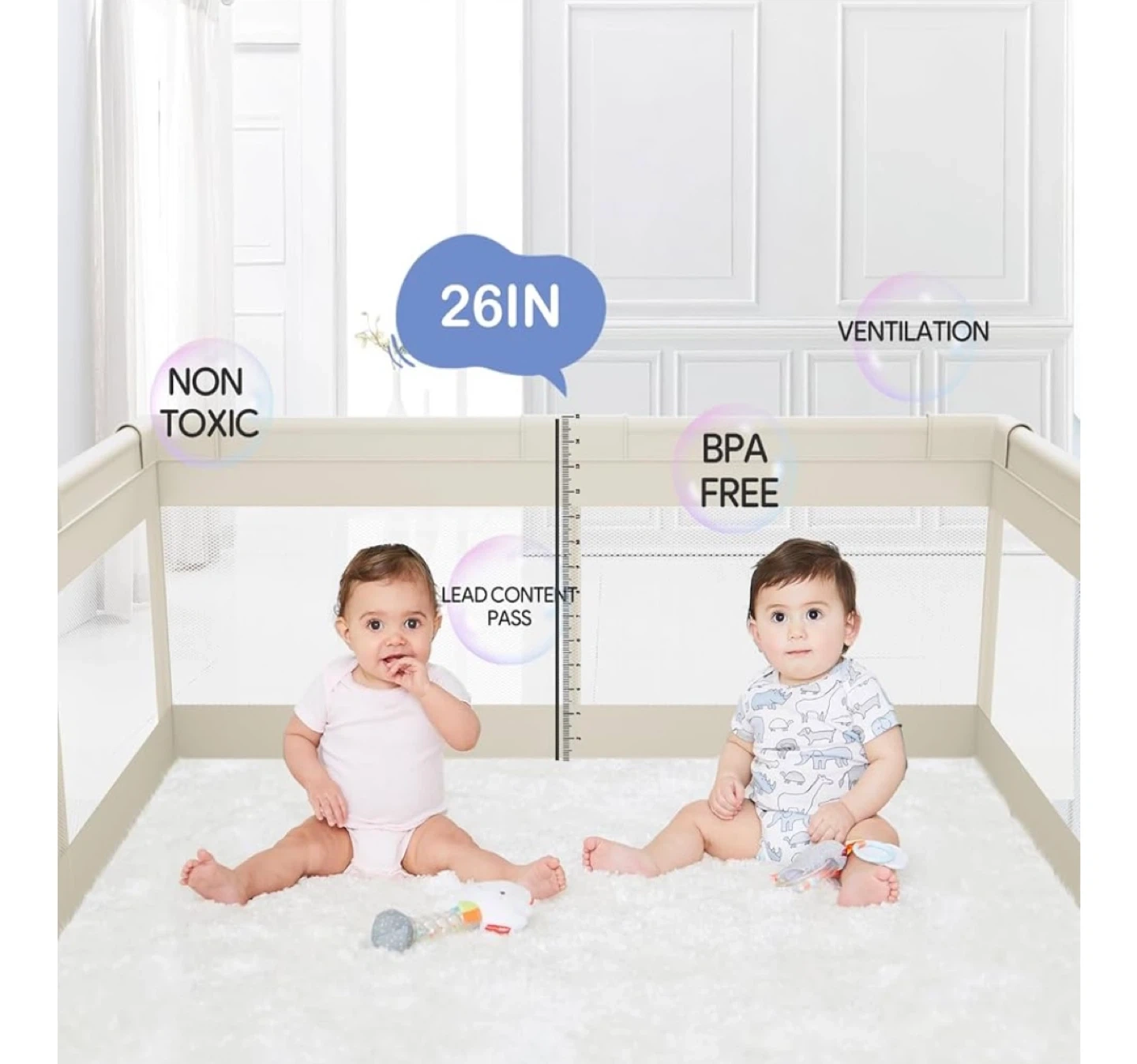 This baby playpen is perfect for keeping your little one safe and entertained! It measures 47 inches by 47 inches and stands 26 inches tall. It's made from non-toxic, BPA-free materials and features great ventilation. It also includes pulling rings!