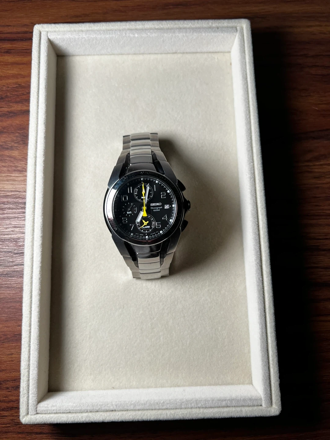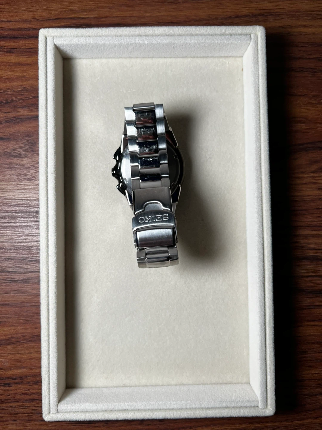Selling a Seiko chronograph watch in great condition! It features a stainless steel band and a black dial. A stylish and functional timepiece for everyday wear