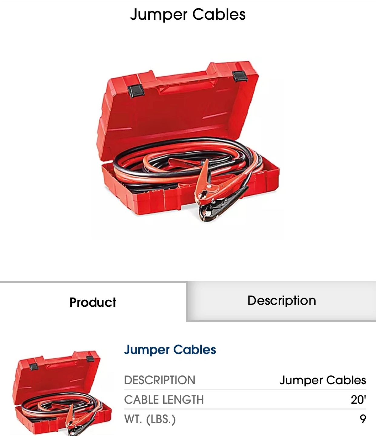 These jumper cables are essential equipment for truck drivers, couriers, and moms! They feature thick, 2-gauge wires and PVC insulation that stays flexible down to -40°C (-40°F). There's also an inline voltmeter to check battery life. Cable length is 20 ft and the weight is 9 lbs. Comes without case.