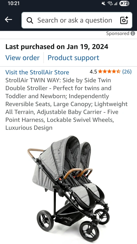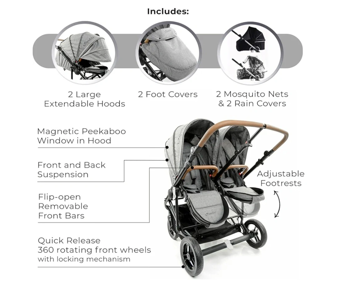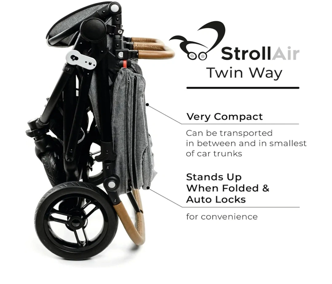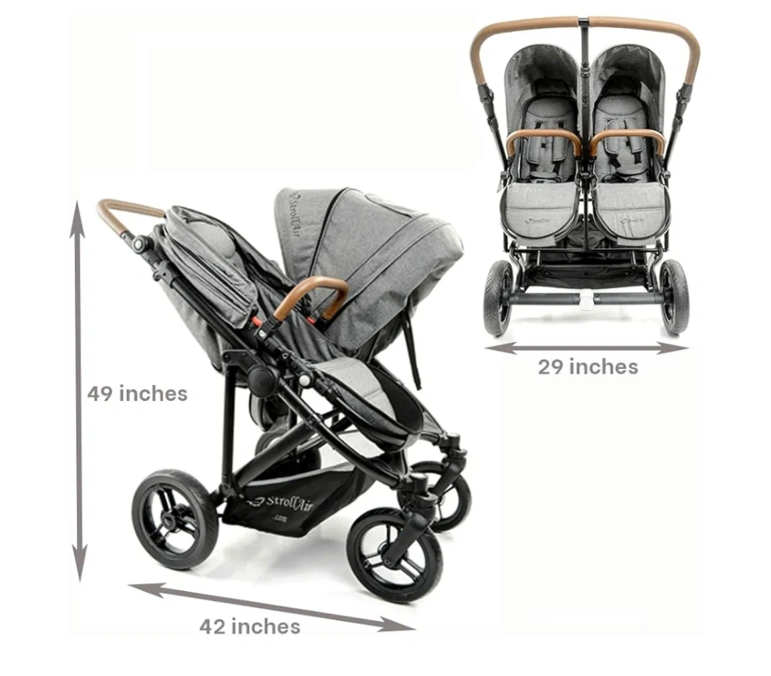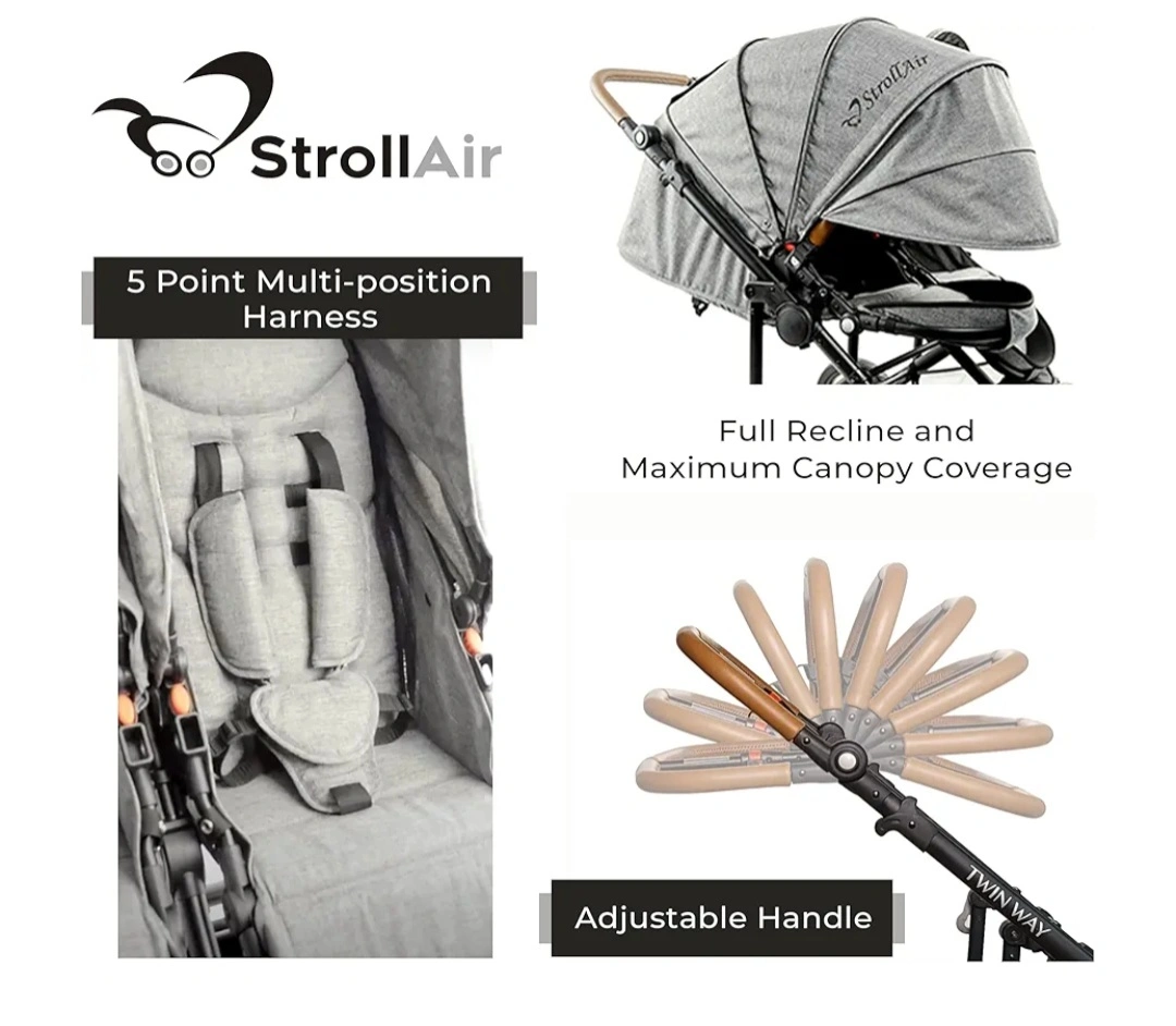 Looking to sell my StrollAir Twin Way double stroller in grey! It's perfect for twins or little ones close in age. This stroller features: - Independently reversible seats - Large canopy - Lightweight all-terrain design - Adjustable baby carrier with a five-point harness - Lockable swivel wheels - Luxurious design Dimensions: - 49 inches tall - 42 inches long - 29 inches wide It also comes with 2 large extendable hoods, 2 foot covers, and 2 mosquito nets and rain covers. It's very compact when folded and stands up with auto locks for convenience