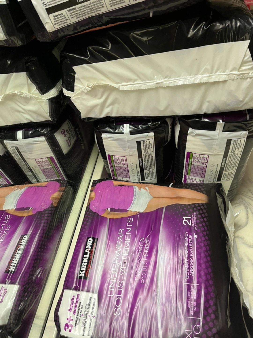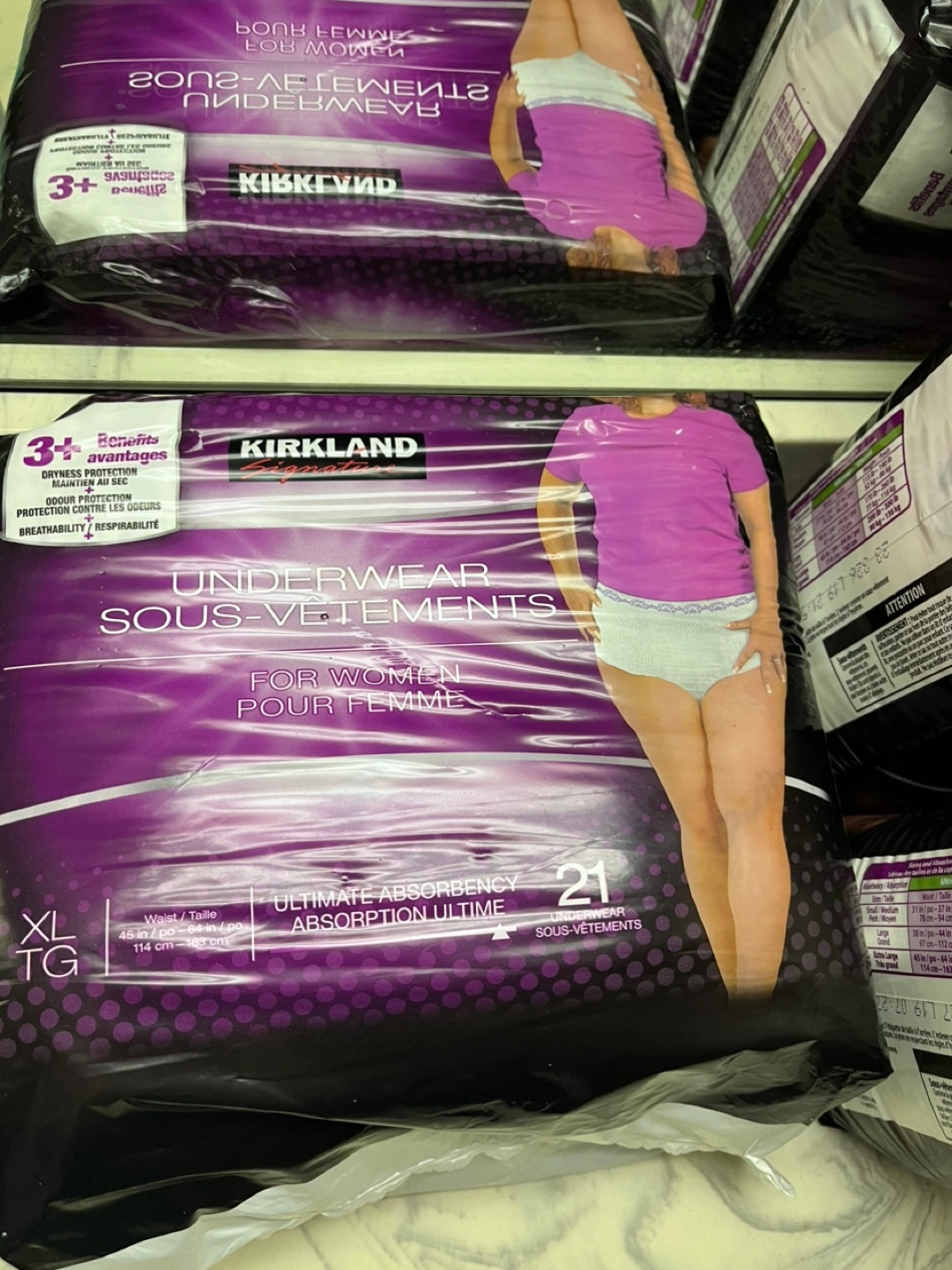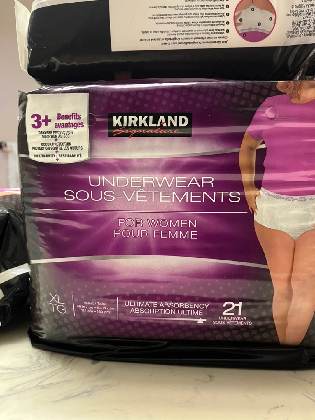 Selling a pack of Kirkland Signature Underwear for Women. They are size XL and the pack contains 21 underwear. Ultimate absorbency for your comfort!
