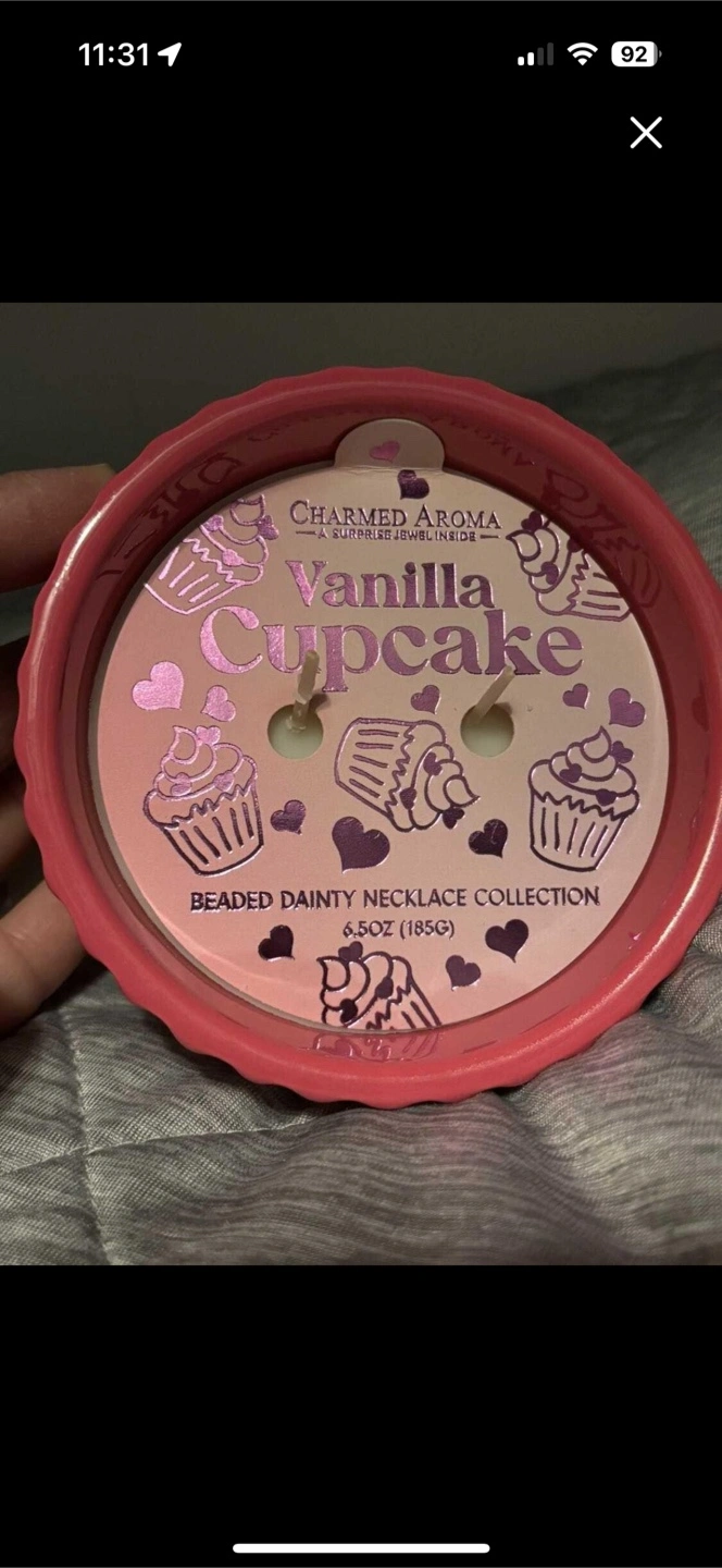 Selling a Charmed Aroma Vanilla Cupcake candle! This candle is 6.5oz and part of the Beaded Dainty Necklace Collection. Enjoy the sweet scent and a surprise jewel inside