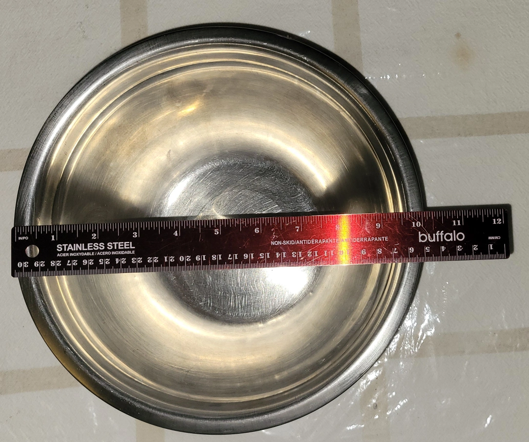 Selling a stainless steel mixing bowl. The ruler in the photo shows it's about 11 inches in diameter. It's in great shape and ready for your baking needs! It's for free only if you get it with another one of my items for sale.