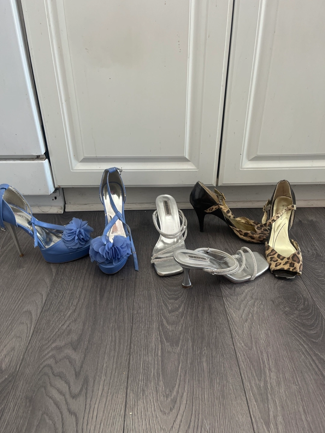 Selling a collection of assorted heels. There's a pair in blue with a flower detail, a silver pair with delicate straps, and a pair in a fun leopard print(in ok condition)