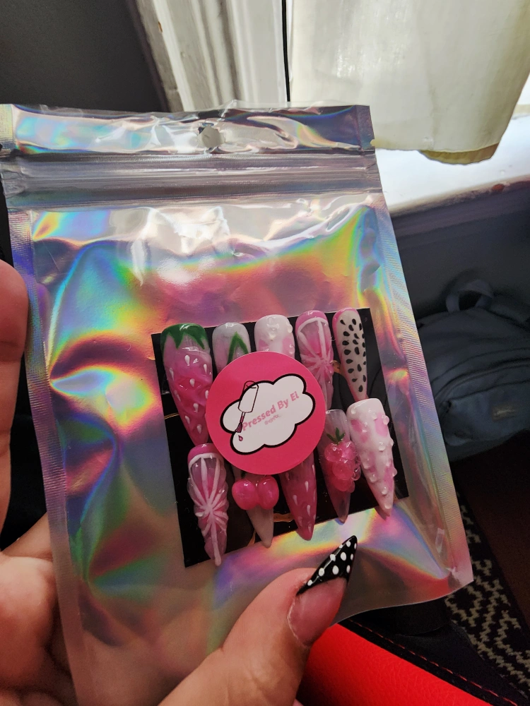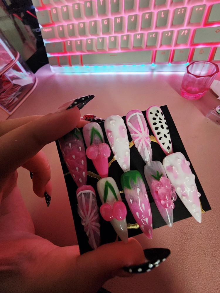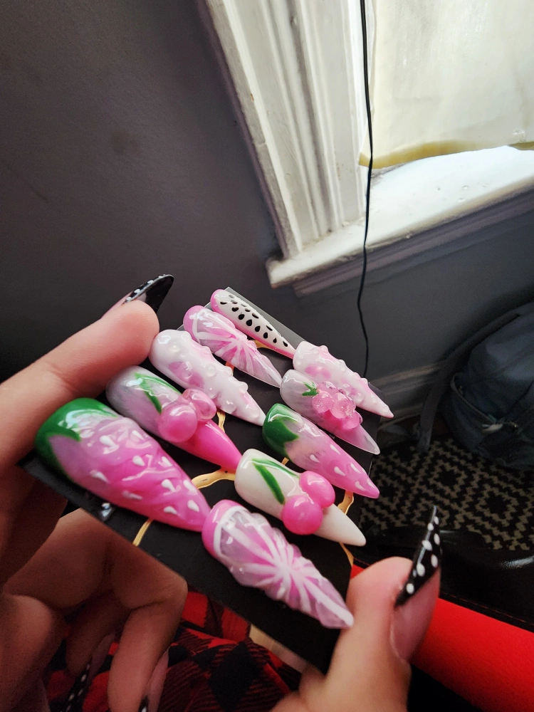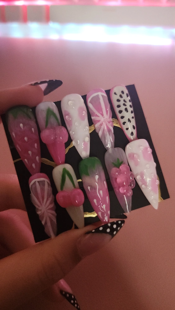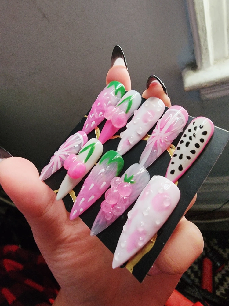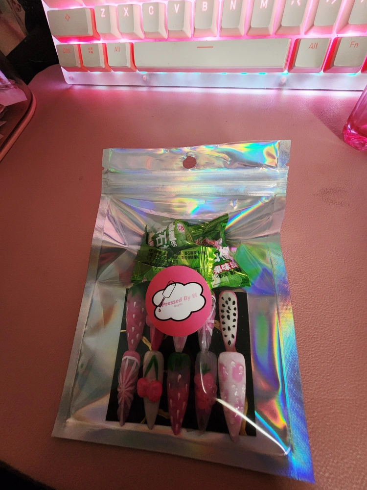 Handmade Fruit Nails size S. Comes with nail file and glue tabs and guava candy.🩷❤🩷 (Can make in different sizes)