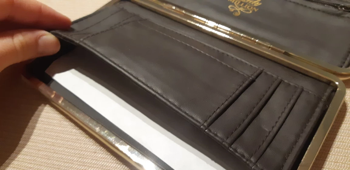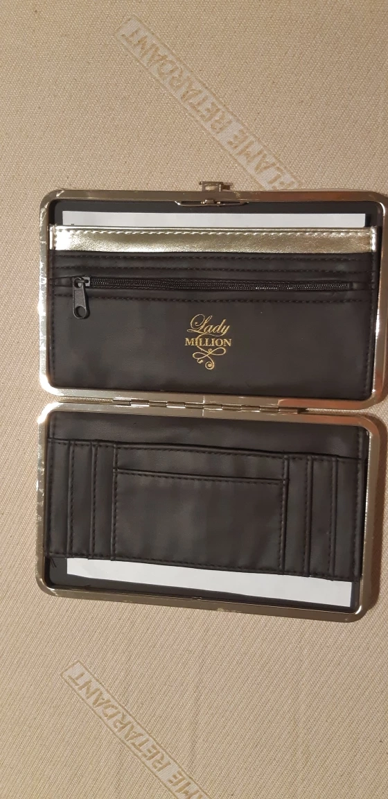 Selling a Lady Million wallet in a good condition. It has a gold-tone frame and a black interior with multiple card slots and a zippered compartment. Perfect for organizing your essentials!