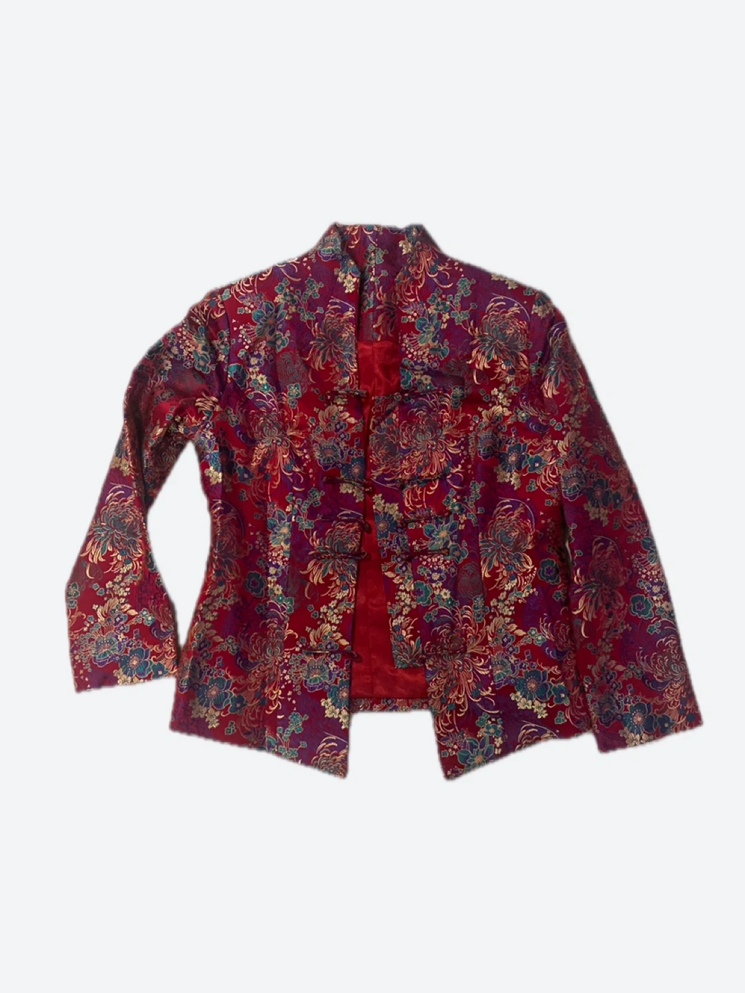 Here's a beautiful red cranberry jacket with a unique Asian floral pattern fabric! It's fully lined and tailored for a sleek silhouette. Sits at hip. Fits about a size 4-6. In great condition and would be a lovely addition to any wardrobe