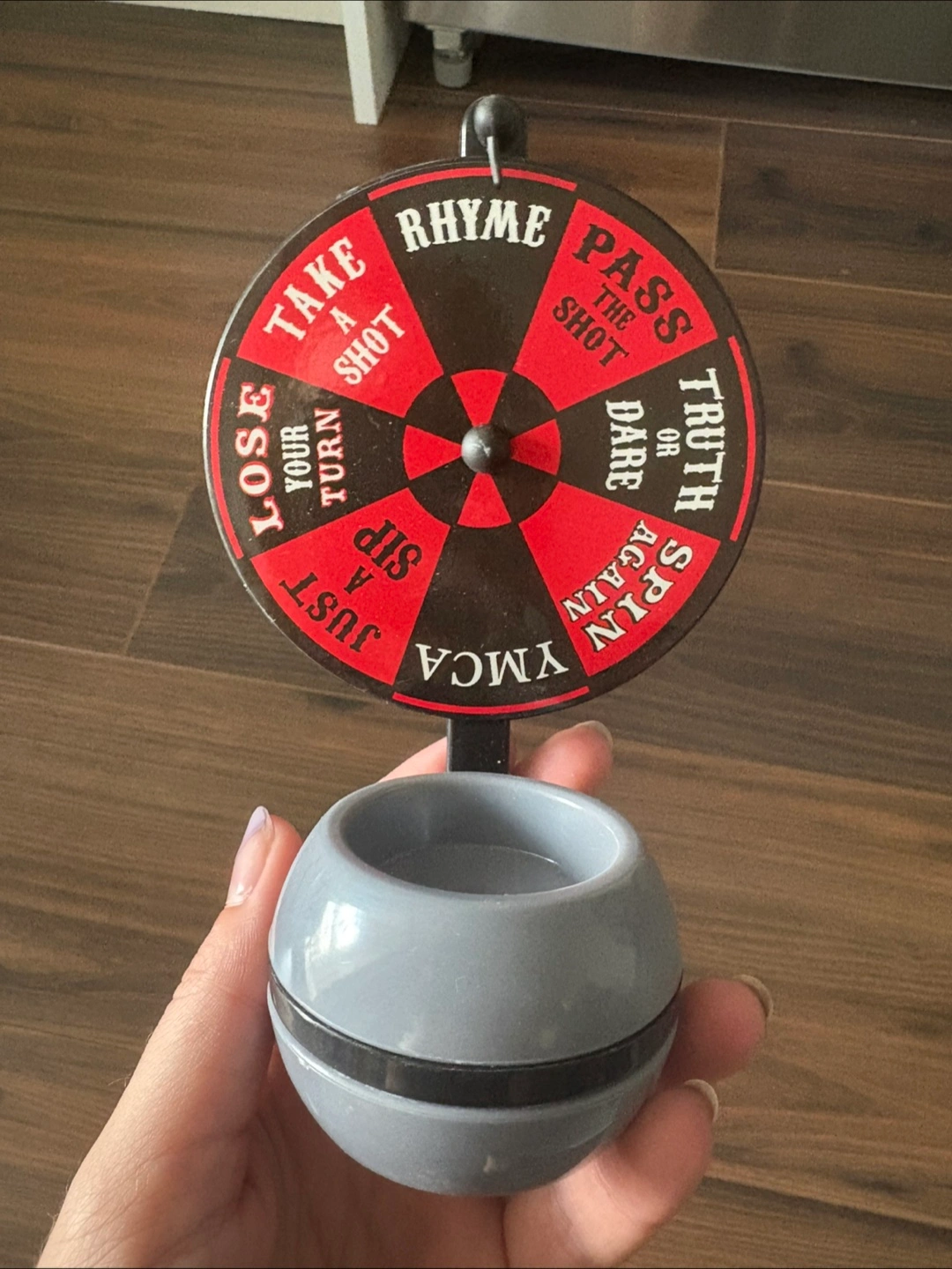 Get ready to have some fun with this spin the shot drinking game! It's perfect for parties and get-togethers. Shot glass not included, pick up near major Makenzie and woodbine