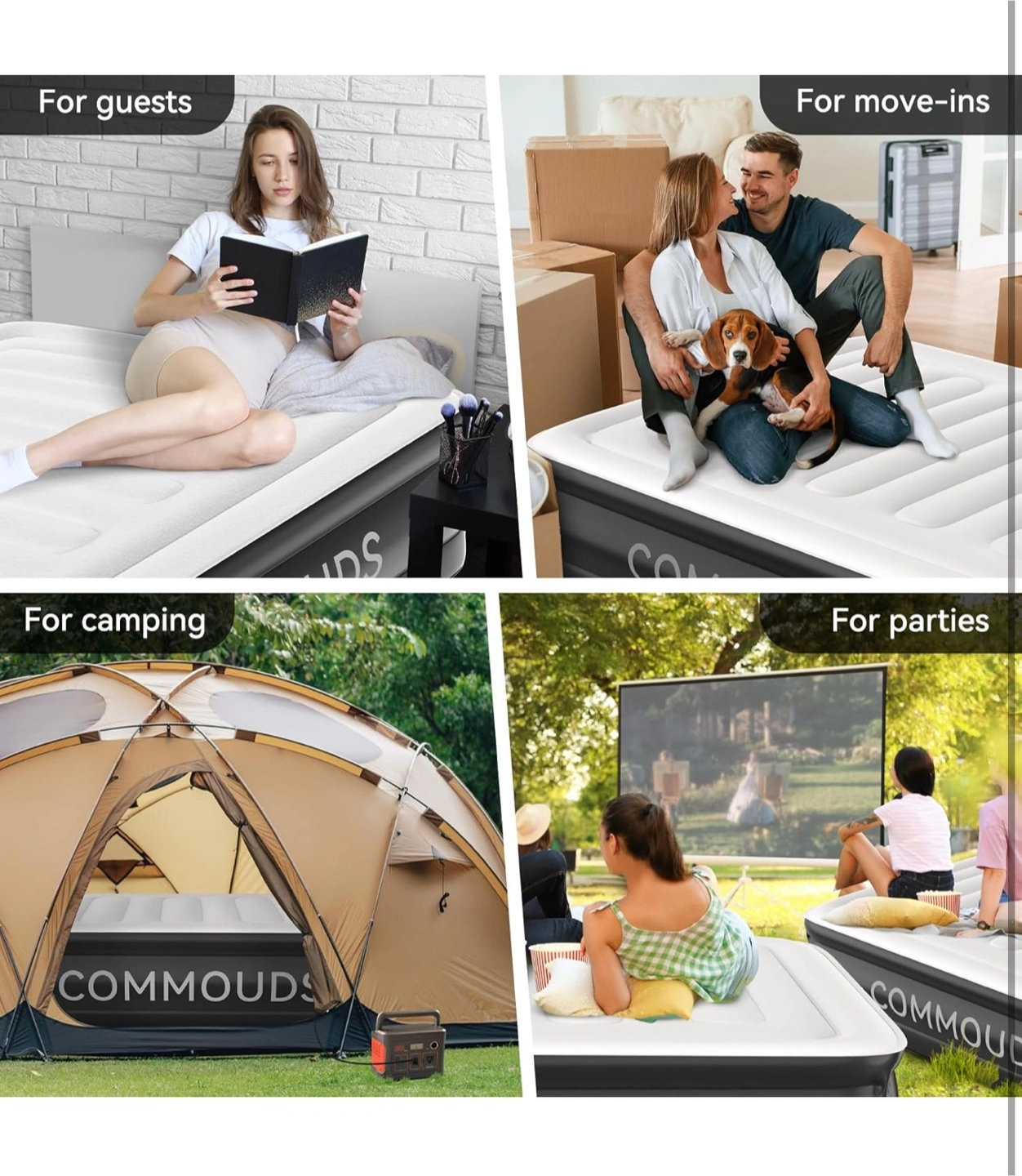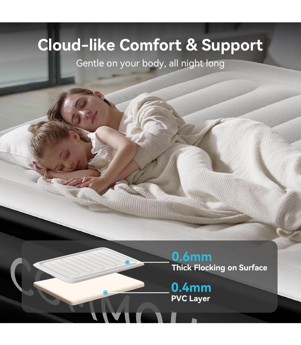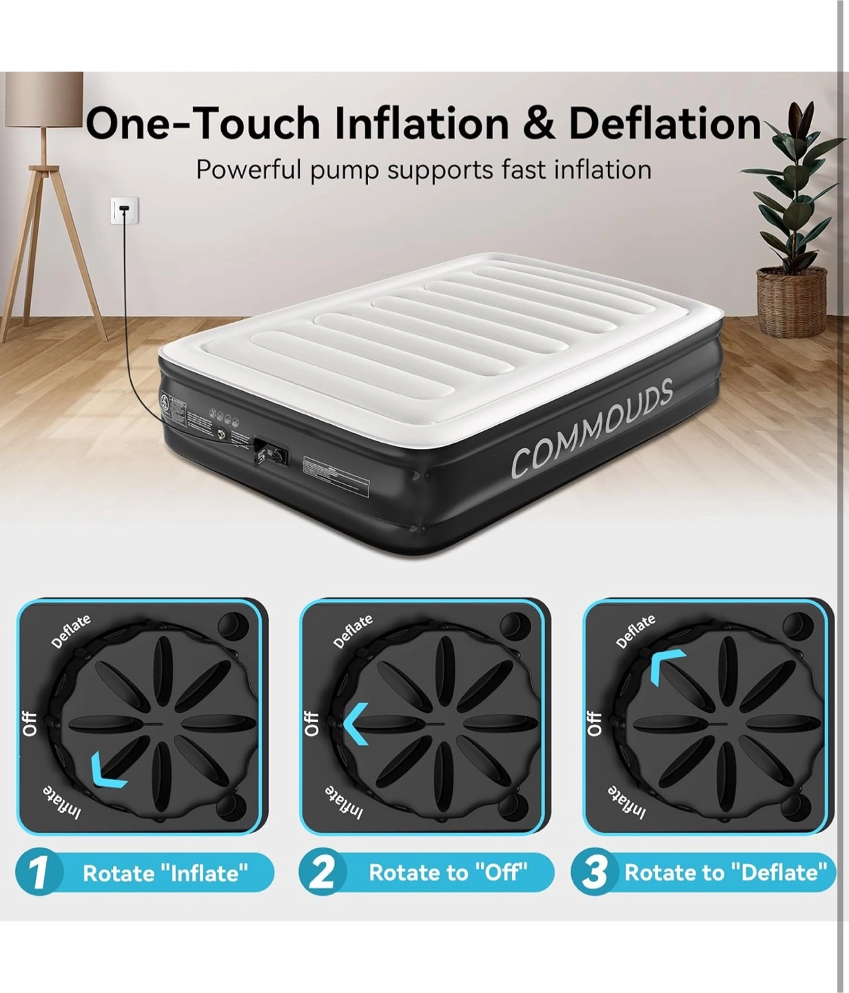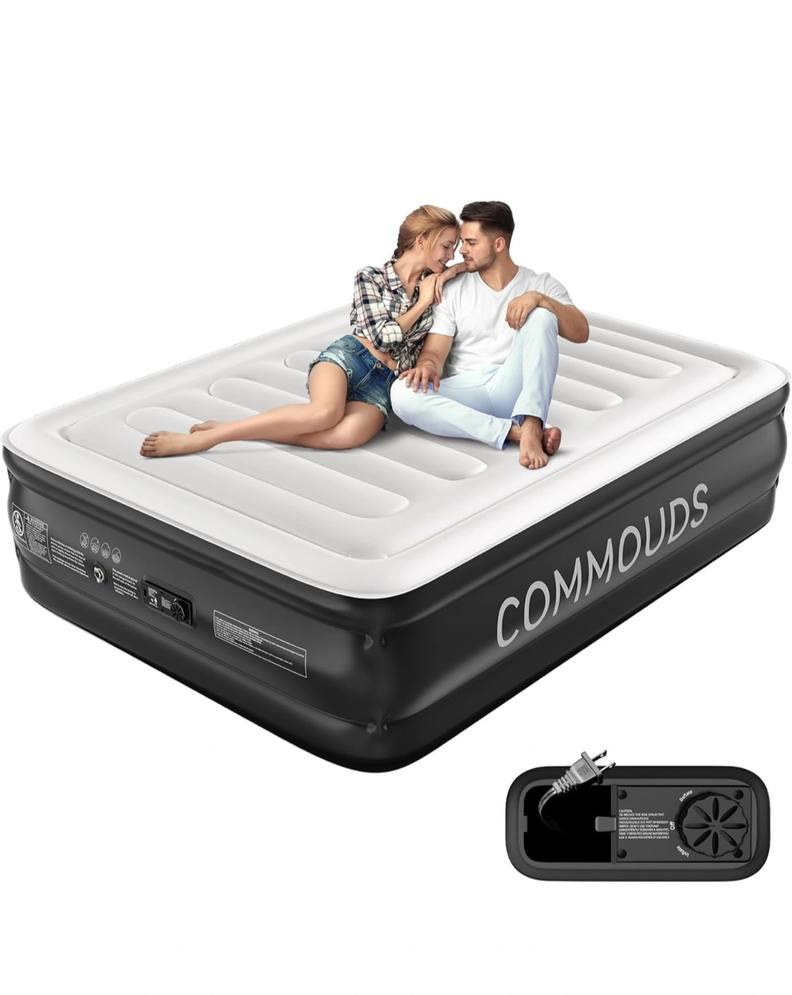 Selling a COMMOUDS air mattress! It features one-touch inflation and deflation with a powerful built-in pump for fast setup. Key features include: - Patented I-beam design - Multi-layer inner construction - 0.6mm thick flocking on the surface for comfort - 0.4mm PVC layers to prevent air loss - Non-slip bottom layer for increased friction