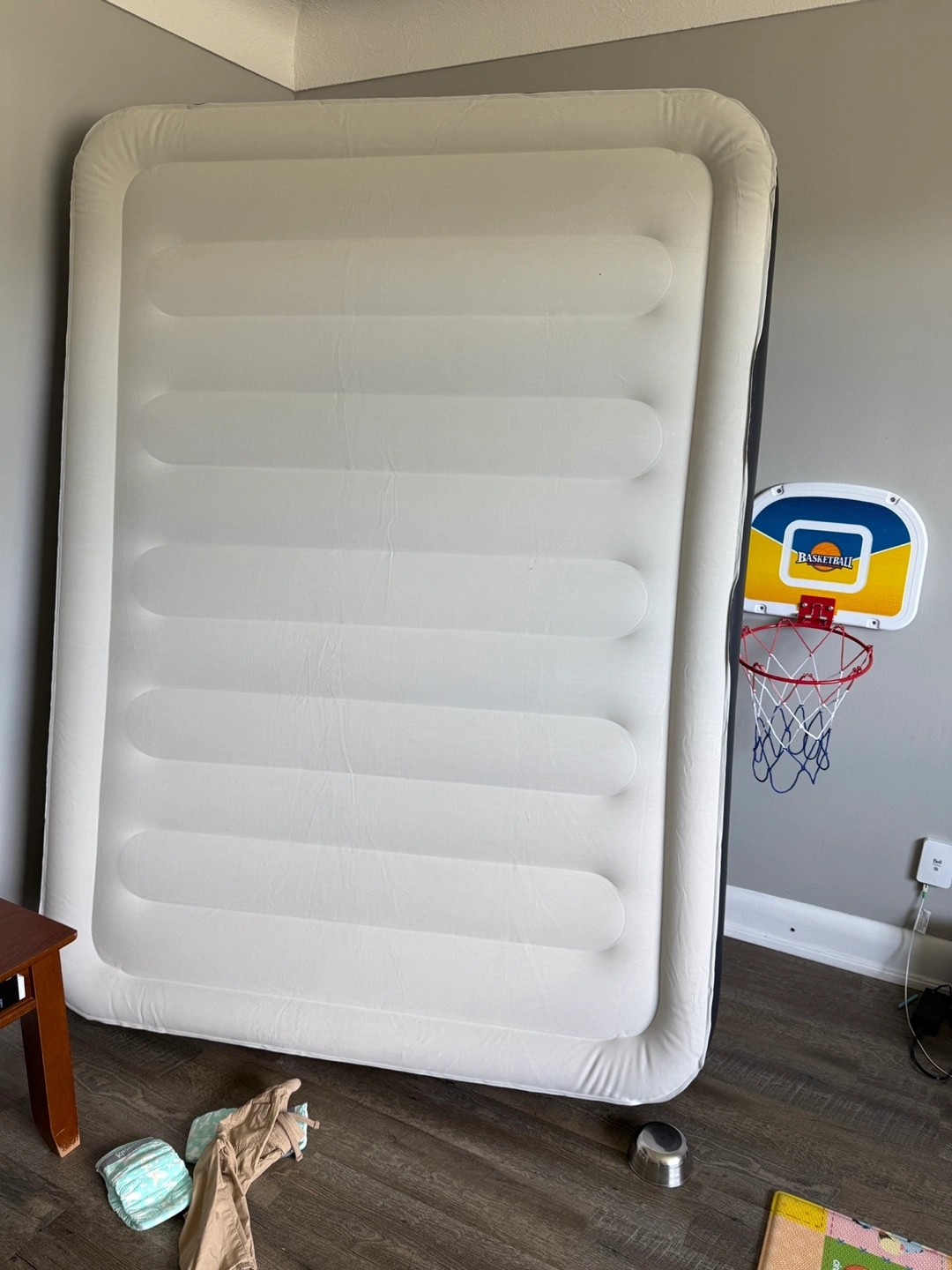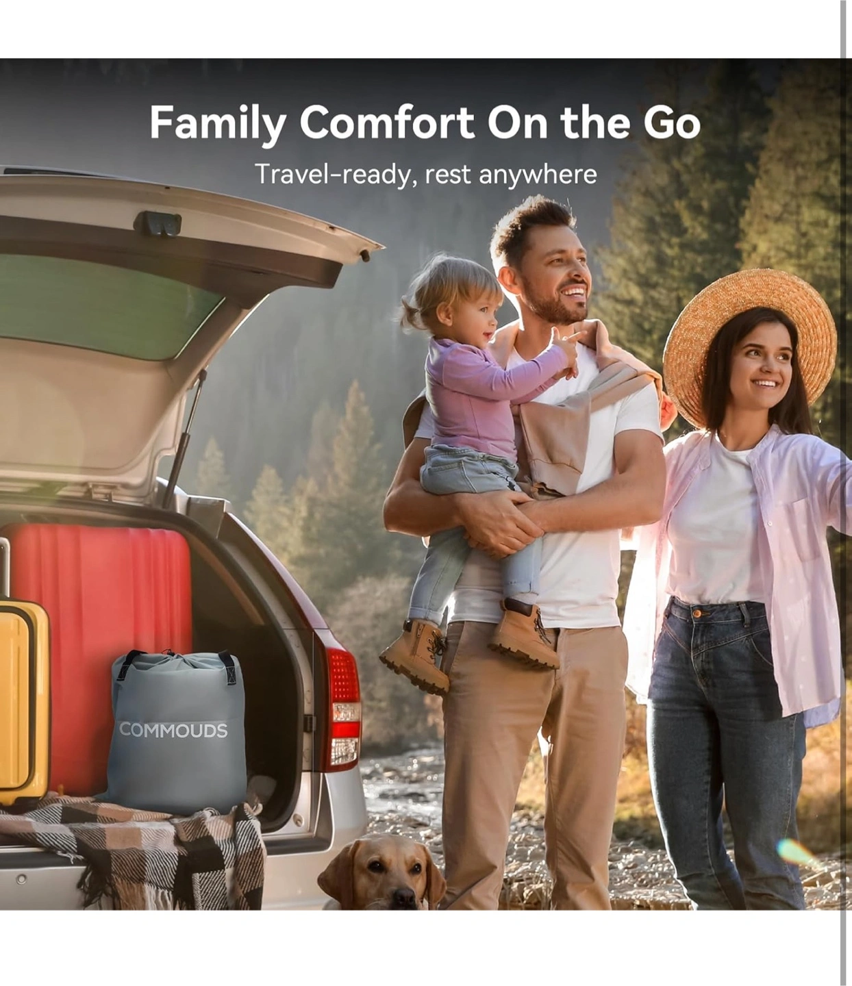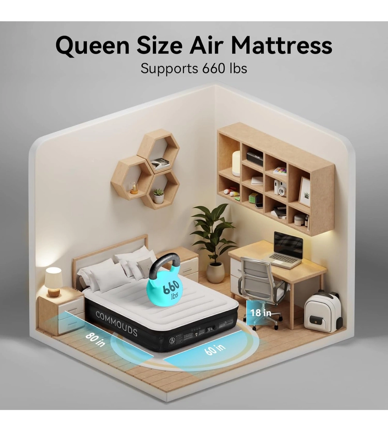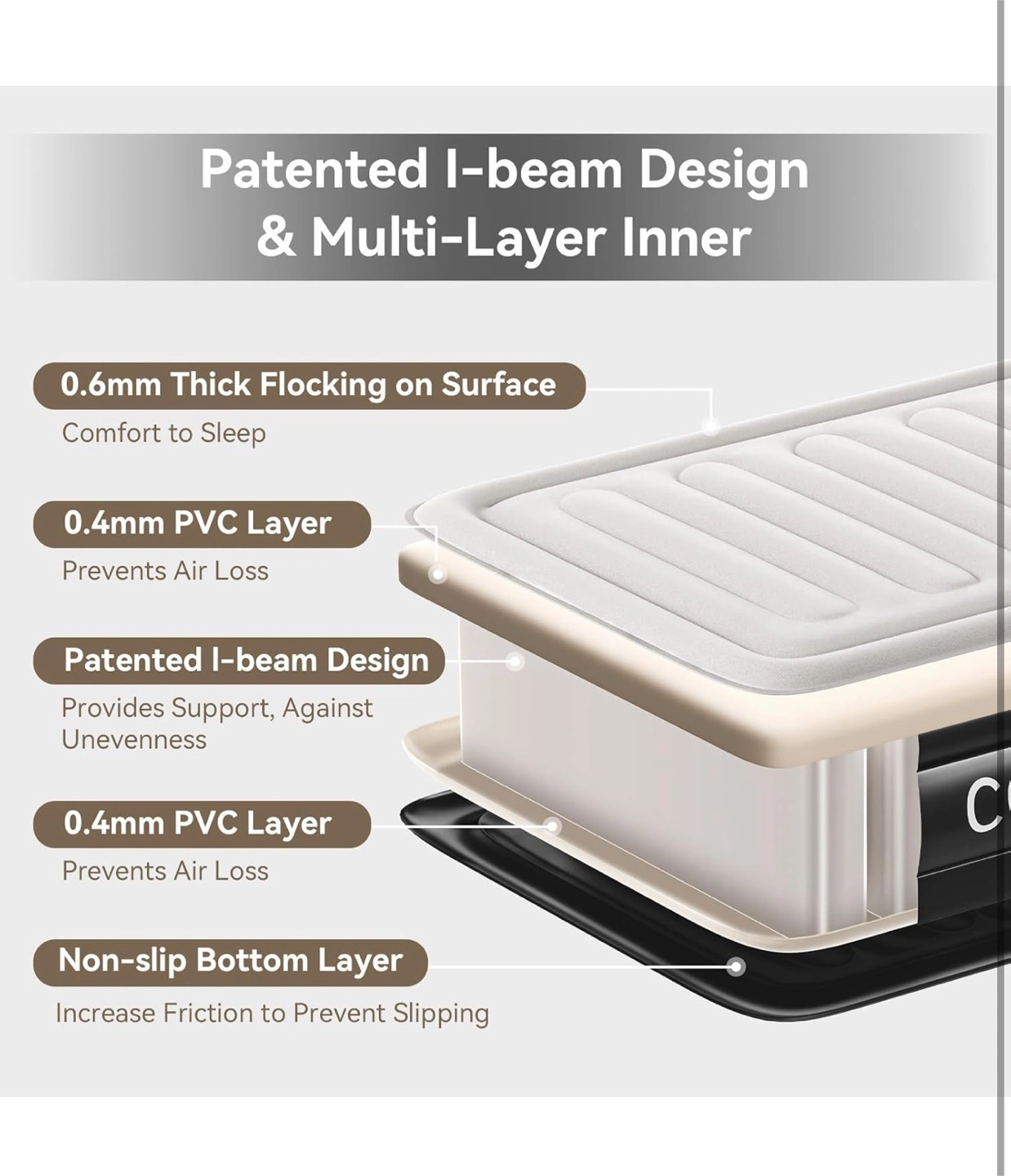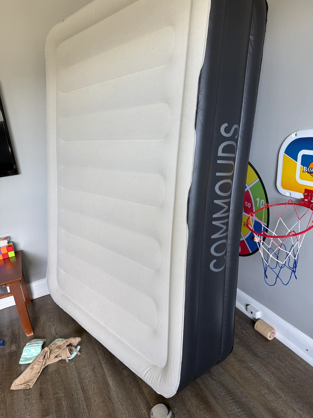 Selling a COMMOUDS air mattress! It features one-touch inflation and deflation with a powerful built-in pump for fast setup. Key features include: - Patented I-beam design - Multi-layer inner construction - 0.6mm thick flocking on the surface for comfort - 0.4mm PVC layers to prevent air loss - Non-slip bottom layer for increased friction