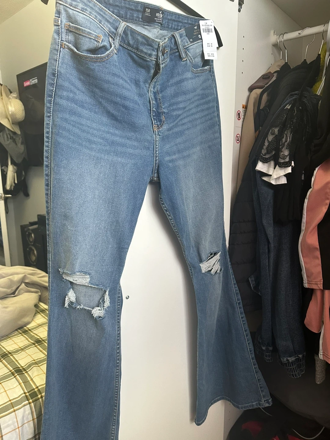 Up for grabs are a pair of Hollister High Rise Vintage Flare jeans! They're a size 15R and feature a stylish, ripped design. Originally bought for $57.95 Pay by cash please