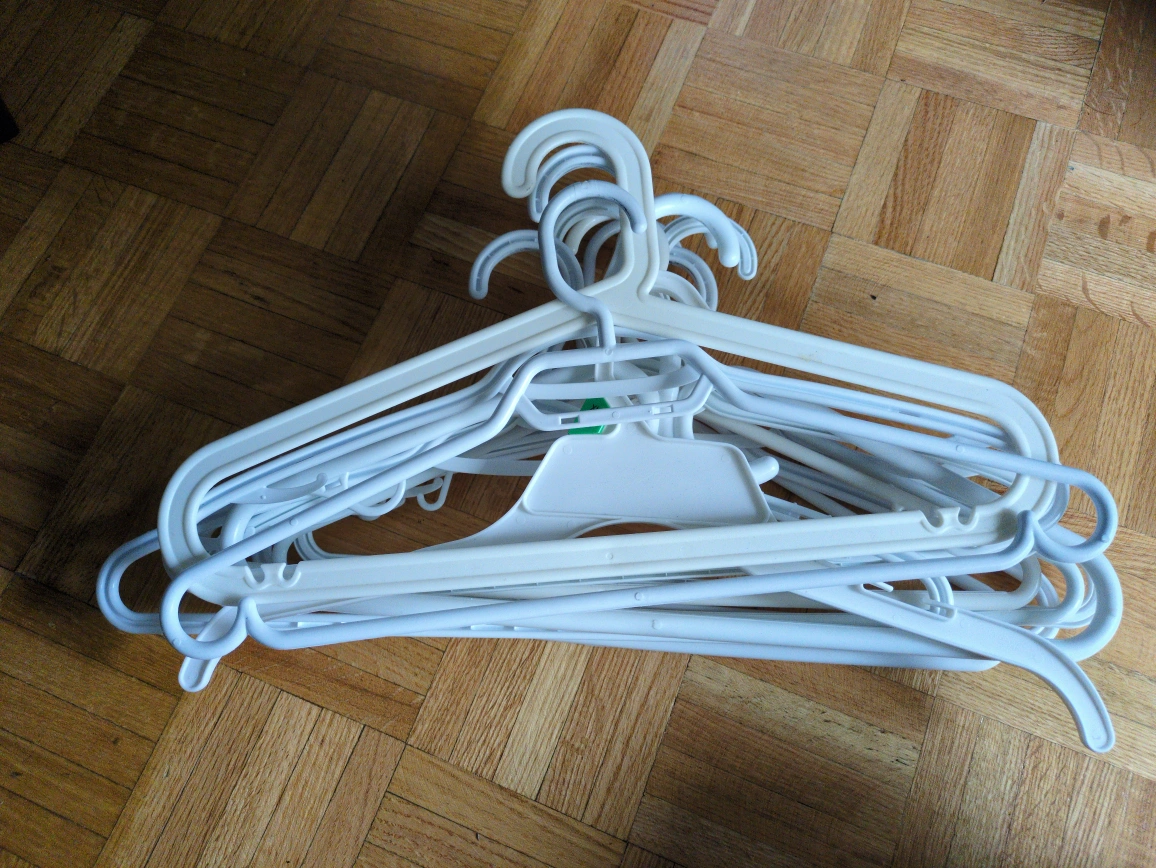 Selling a set of white plastic clothes hangers. These are great for organizing your closet and keeping your clothes neat and tidy! They're in good condition and ready for a new home