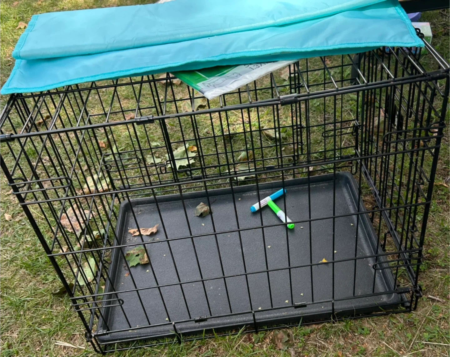 Selling a used dog crate. It's a black wire crate with a black plastic tray. Also includes a blue cover.