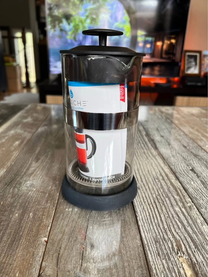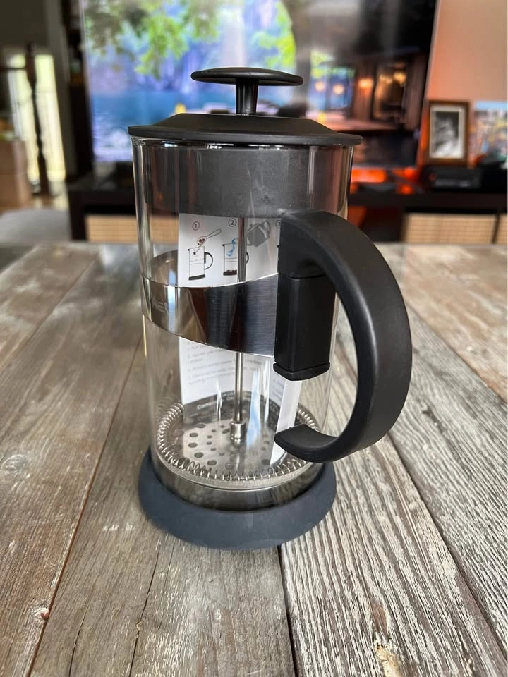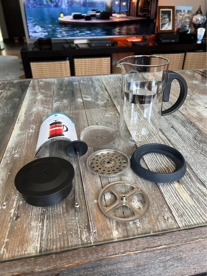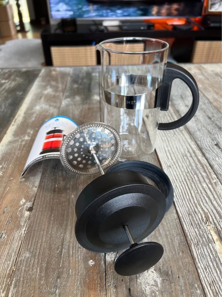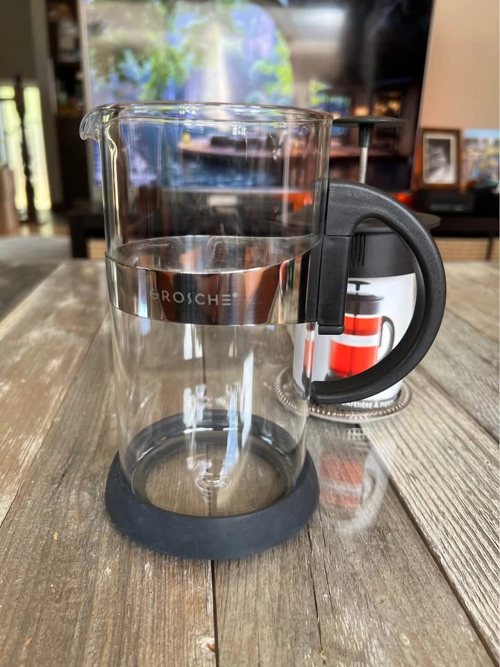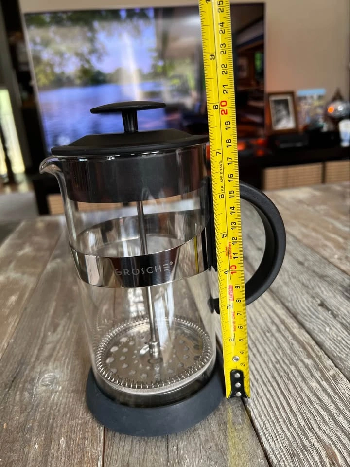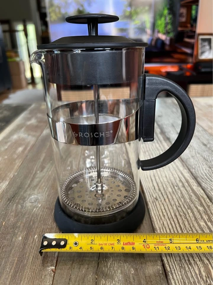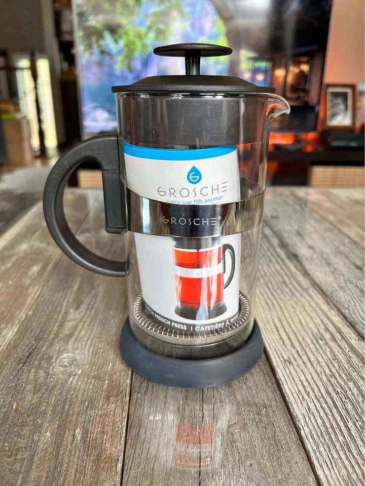 Brew the perfect cup of coffee with this Grosche French Press. This coffee maker is in excellent condition and ready to help you start your day right. It features a durable glass carafe, a fine mesh filter, and a sleek, modern design. Additional features include: * Capacity: 3 cups * Material: Glass, stainless steel * Easy to clean * Stylish design Add a touch of elegance to your morning routine.