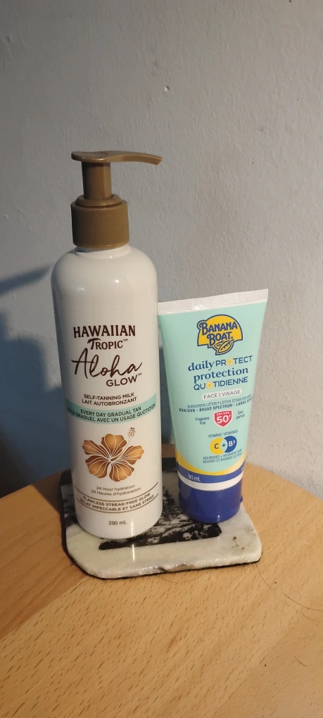 Hi Karrots π₯ π π Selling a Hawaiian Tropic Aloha Glow self-tanning milk and a Banana Boat Daily Protect sunscreen for face. The Hawaiian Tropic bottle contains 290ml, and the Banana Boat sunscreen is 90ml. Perfect for summer!