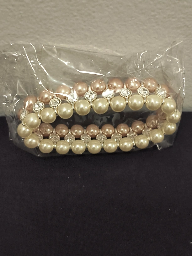 Here's a lovely set of pearl and crystal bead bracelets! They come in a mix of cream and light pink shades, adding a touch of elegance to any outfit. The bracelets are still in their original packaging, so they're in new condition and ready to wear