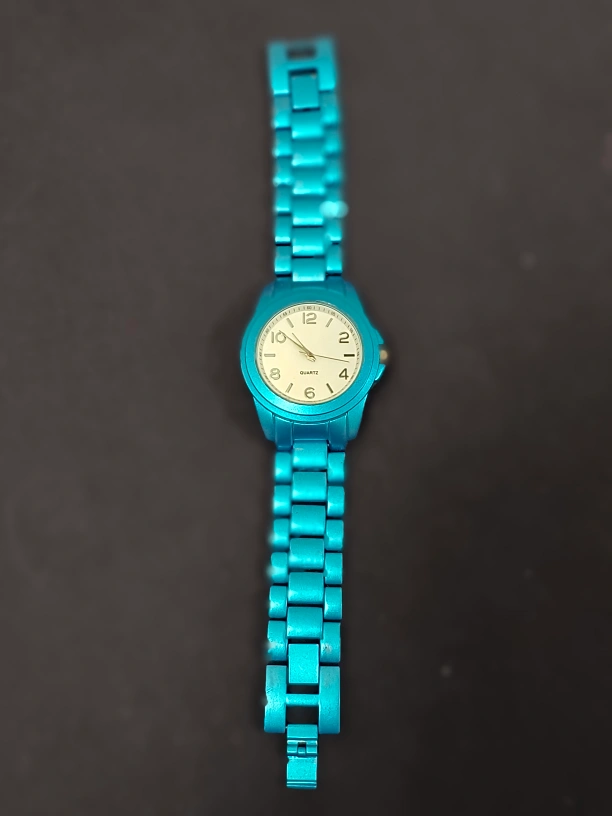 Selling a blue Quartz watch. It features a metal band and a white watch face with numbers. It's in great condition and ready for a new home!