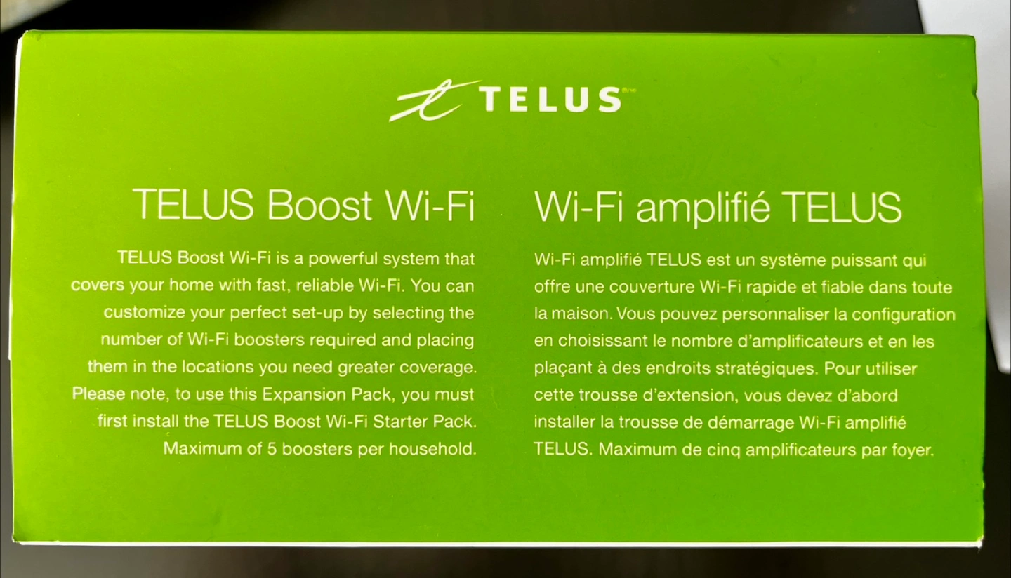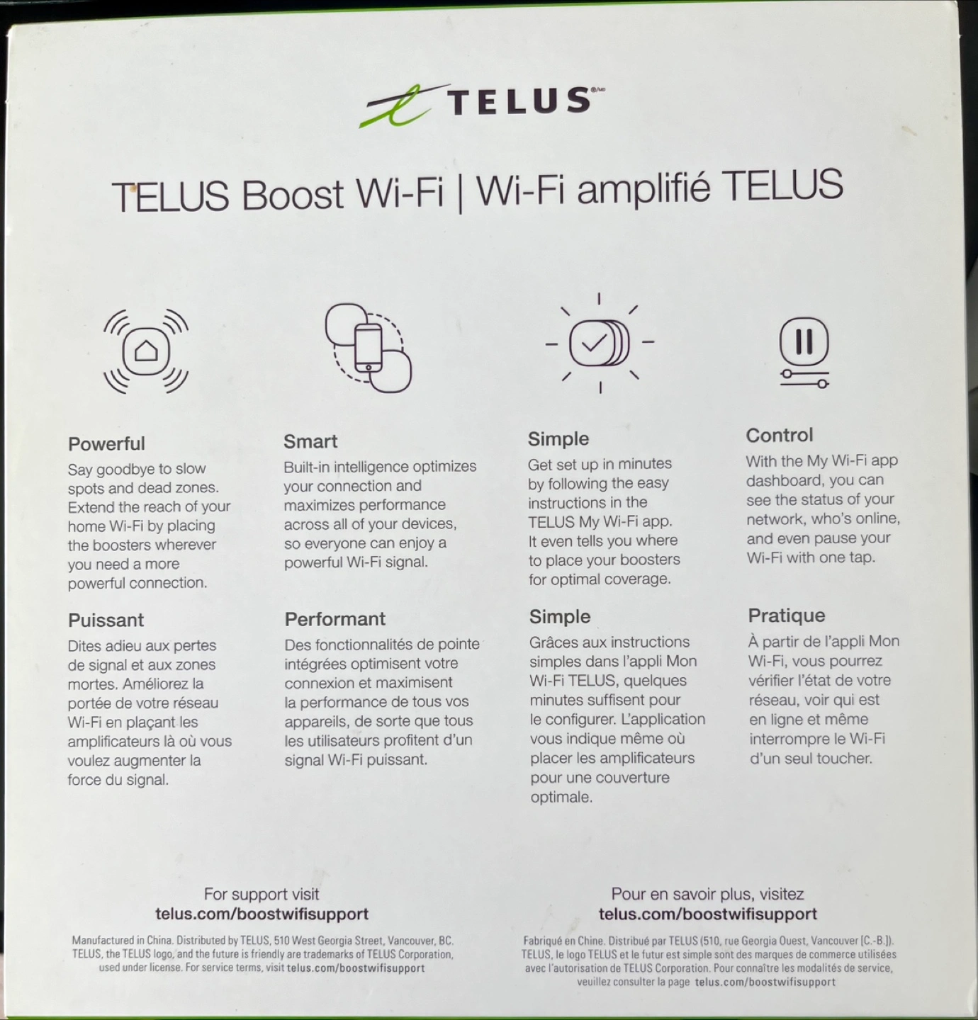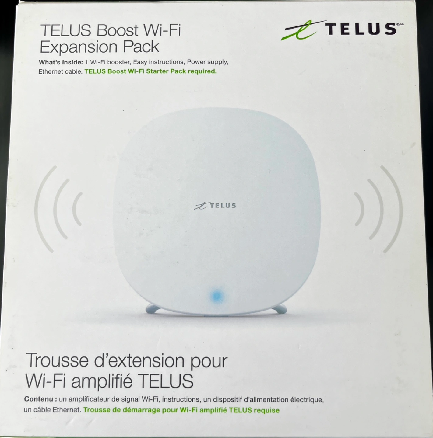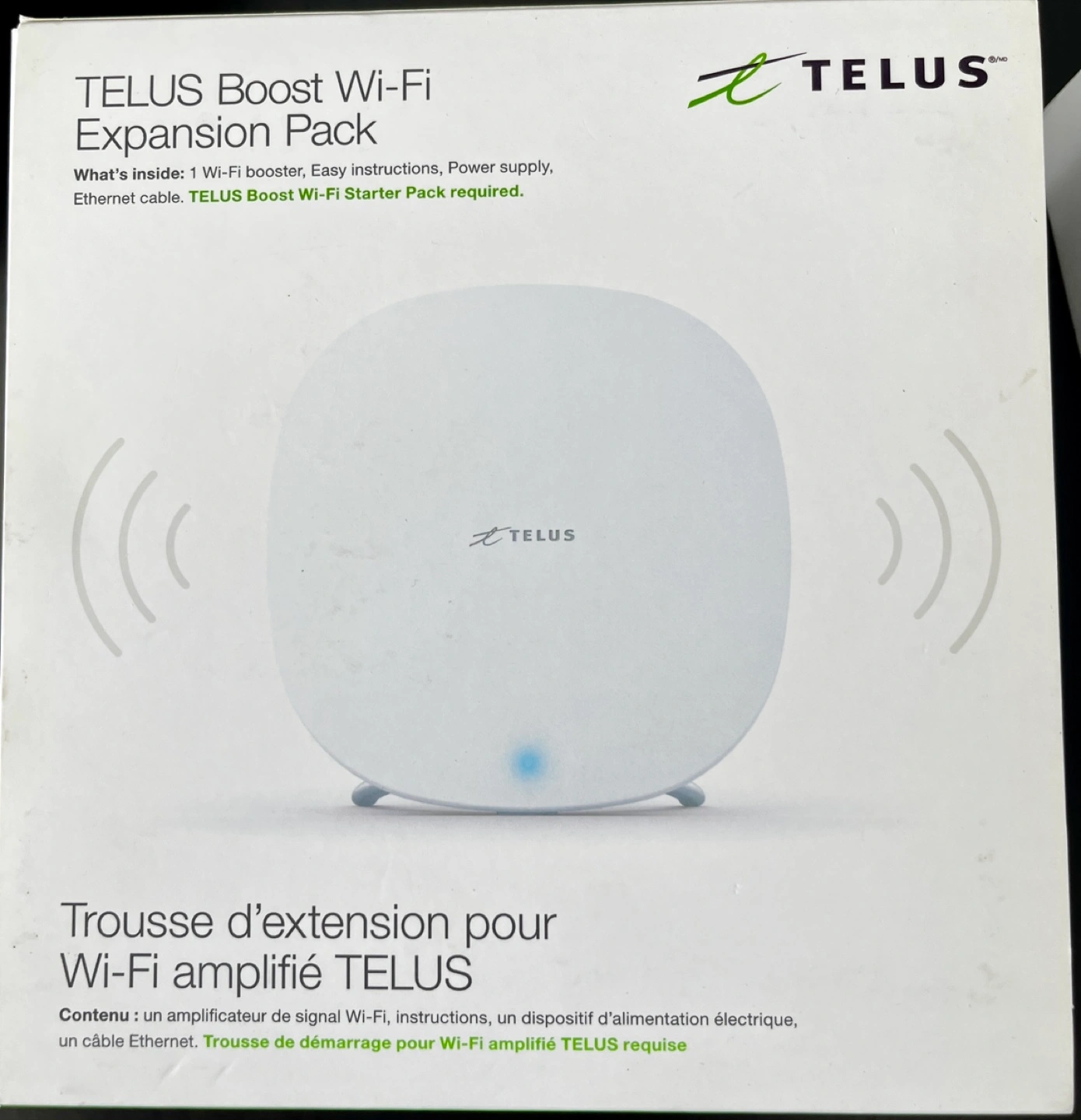 Selling 2 Telus Boost Wi-Fi Expansion Pack in excellent condition! It comes with: - 2 Wi-Fi booster - Easy instructions - Power supply - Ethernet cable It's designed to extend the reach of your home Wi-Fi by placing the boosters wherever you need a more powerful connection. The box is also included!