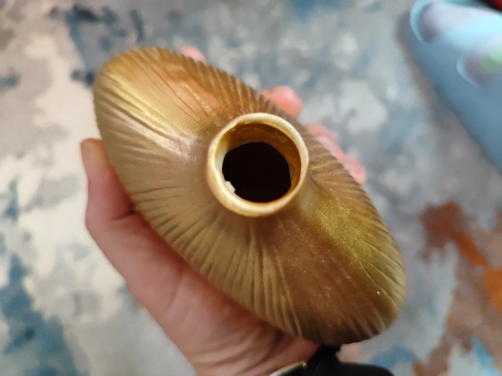 This is a beautiful gold decorative vase that would look great in any room! It has a unique shape and a lovely gold finish. Perfect for adding a touch of elegance to your home decor