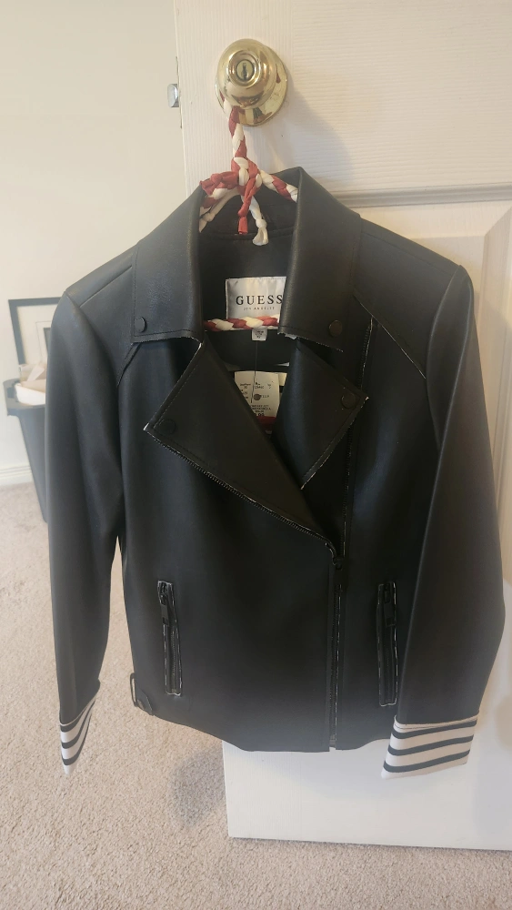 Selling a Guess black faux leather moto jacket in size XS. It's in great condition and ready for a new home! The jacket features a stylish asymmetrical zip closure and striped detailing on the cuffs. Perfect for adding a bit of edge to any outfit!