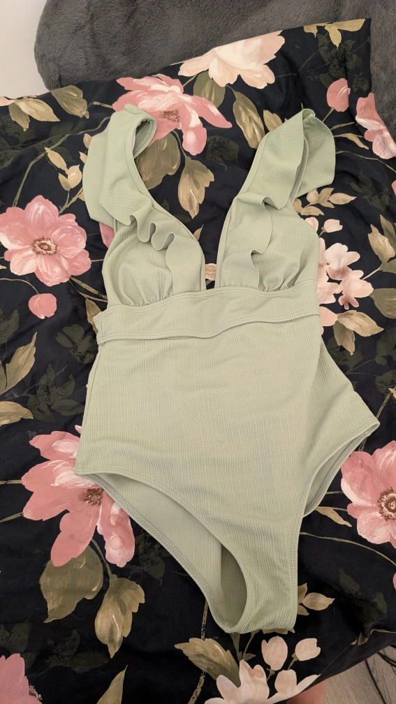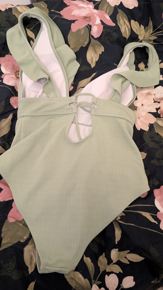 This is a cute green one-piece swimsuit. It features a ruffled design around the shoulders and a tie-up back. Perfect for a day at the beach or pool! been used, dont know the size