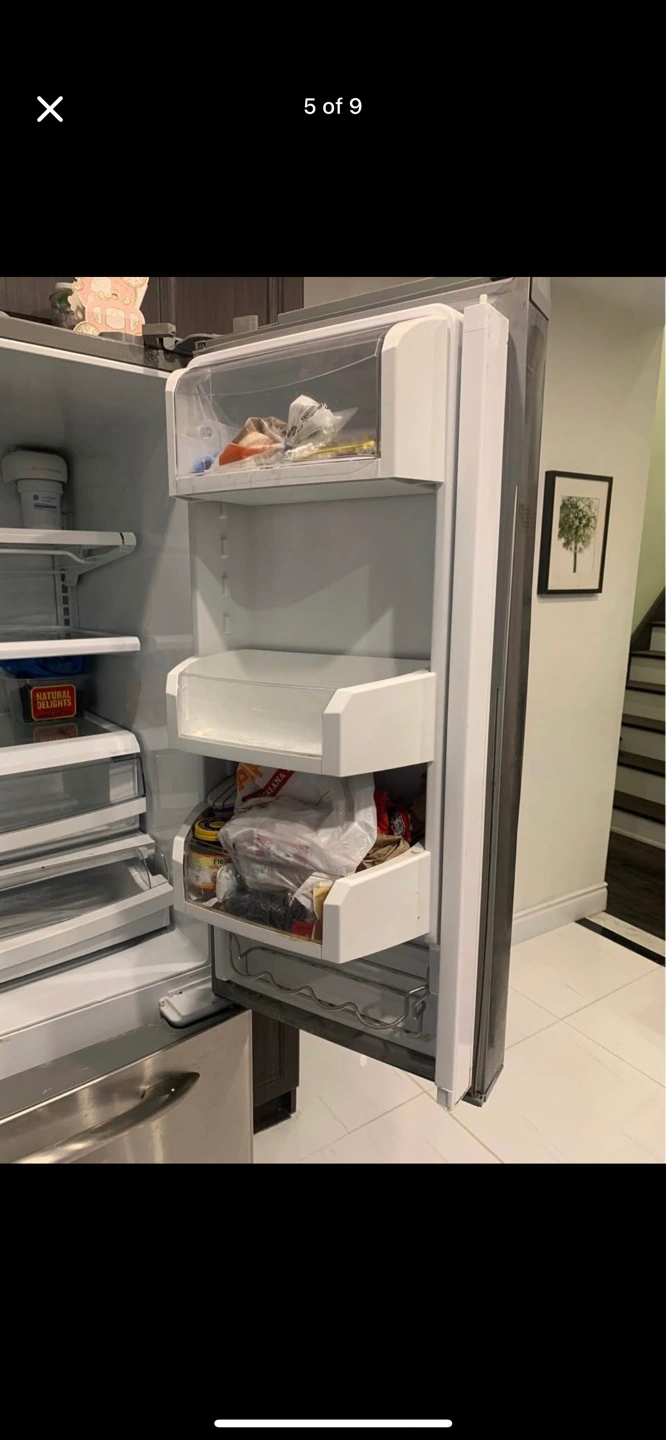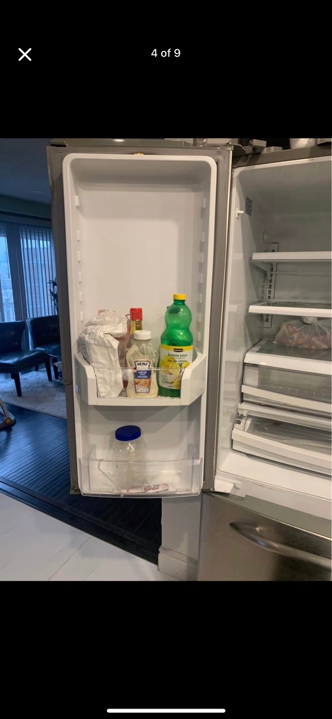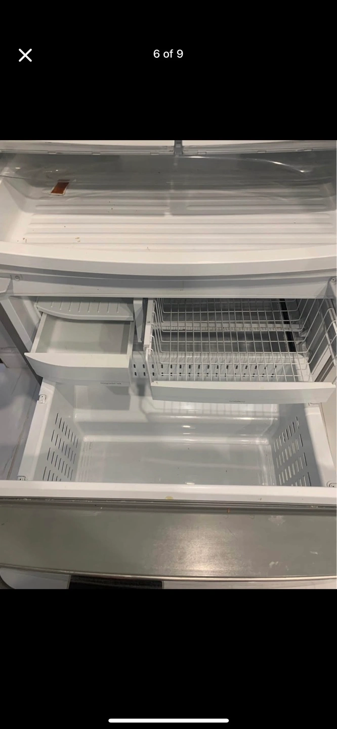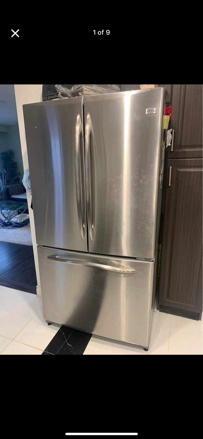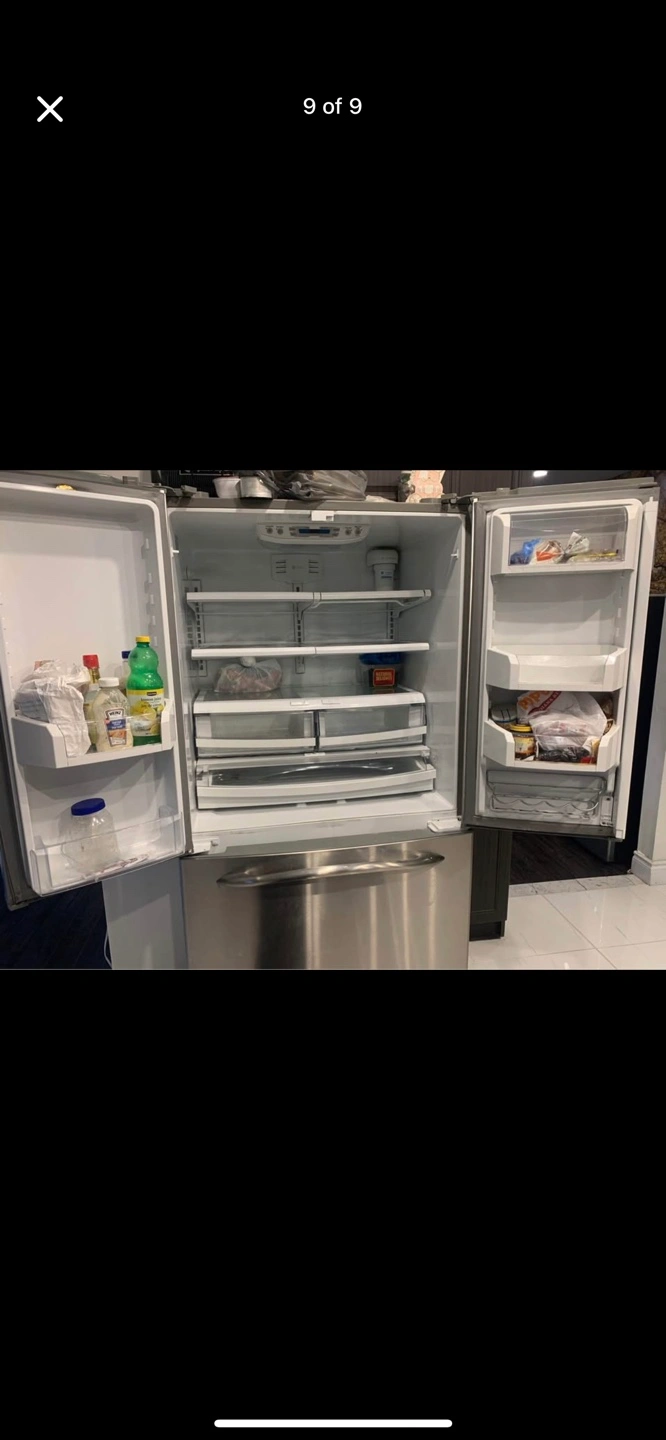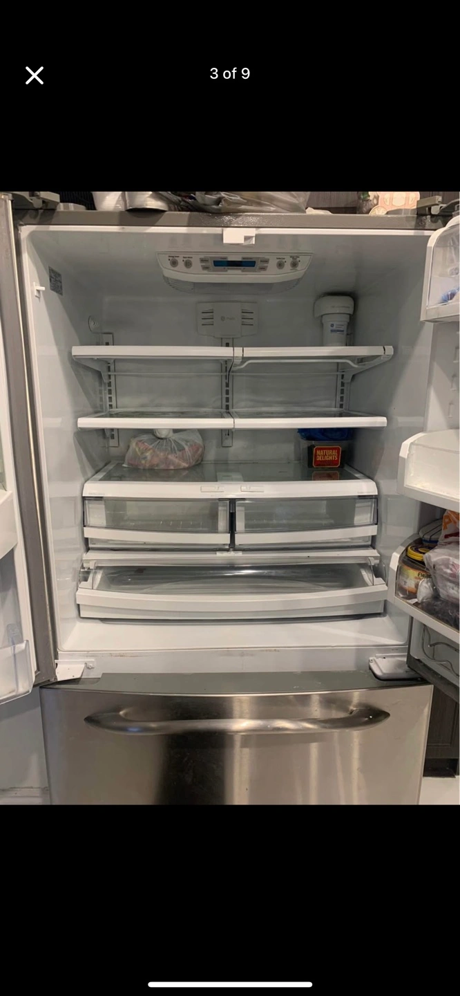 Selling a GE French door refrigerator in stainless steel. It's in good condition and ready for a new home. It features a spacious interior with adjustable shelves and drawers to keep your groceries organized. The freezer is a pull out drawer at the bottom.