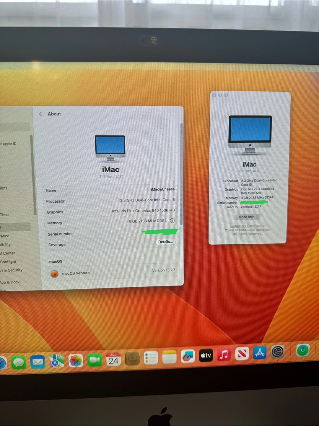 ποΈ Selling a well-maintained 21.5-inch iMac from 2017. It features a 2.3 GHz Dual-Core Intel Core i5 processor and Intel Iris Plus Graphics 640 1536 MB graphics card. It also includes 8 GB of 2133 MHz DDR4 memory. Runs on macOS Ventura 13.7. The computer works well and looks like brand new (no scratches or any damages), but there is a small internal stain on the screen on the bottom left corner (shown in pictures, please take a look). However, that doesnβt affect its performance in any way. ππ» The computer is formatted and ready to use. The monitor will be handed with a protective cloth (original Apple packaging), and the manual/informative manual. π MOVING OUT SALE π΅ PAYMENT IN CASH OR E-TRANSFER π OPEN TO OFFERS Note: Keyboard and mouse not included.