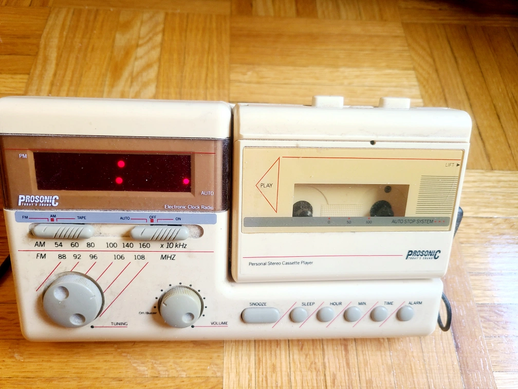 Looking to sell this Prosonic PCR-237 AM/FM Clock Radio with Cassette Player! It's a vintage piece with a classic design. Working condition is unknown.