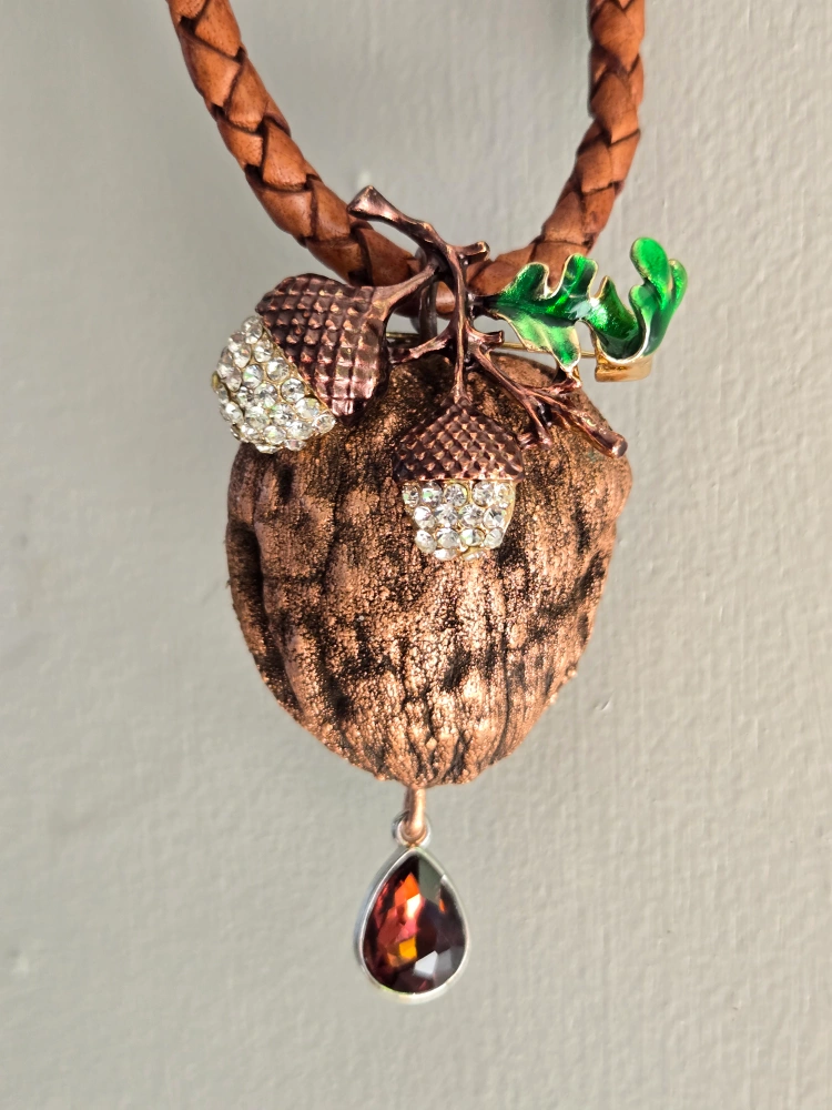 A unique acorn pendant necklace! It features a brown braided cord, a large acorn pendant with crystal accents, and a teardrop gem. It's a charming piece to add to your jewelry collection.