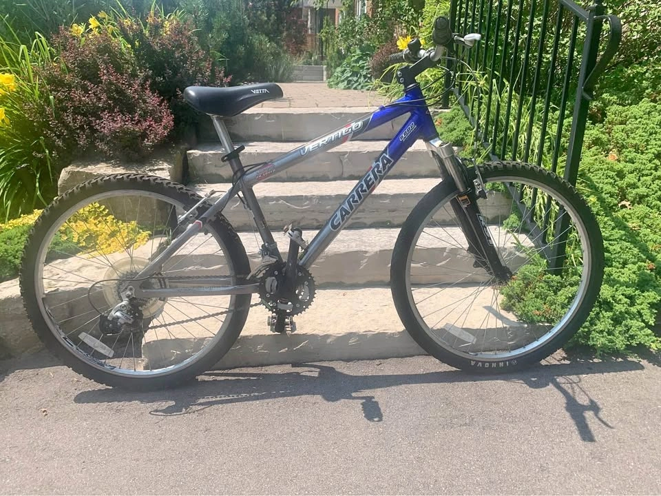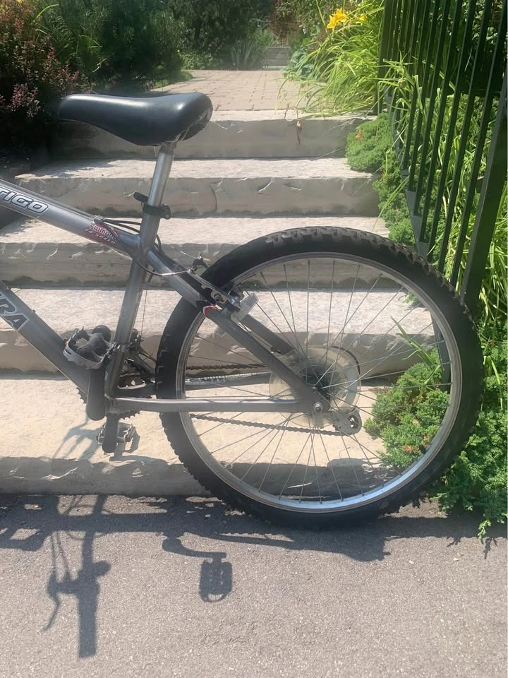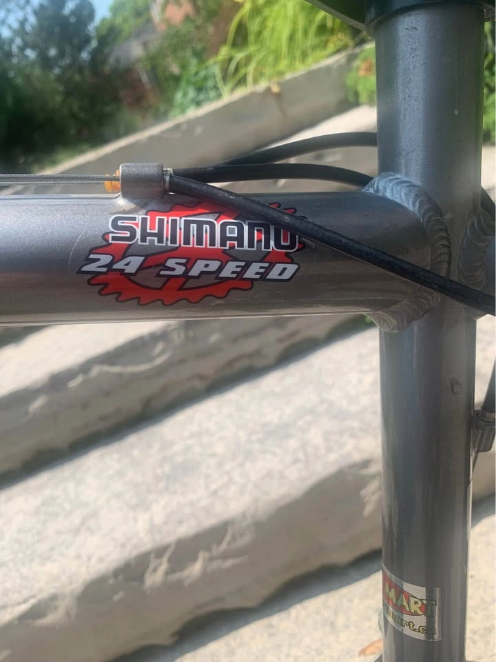 Frame Size: 16" Frame Material: aluminum Tire Size: 26x1.95, matching and inflated Rim Material: appears to be aluminum Stand Over Height: 30" Speed: 24 Gear Shifter: GripShift twist grip style Front Derailleur: Shimano Rear Derailleur: Shimano Altus derailer Brake Type: Promax rim brakes Crank Set: SR Suntour aluminum crank arms; metal pedals with integrated reflectors Seat: Vetta padded seat Front Suspension: RST suspension Colour: gray with bold graphics Grip: rubber grips l Extras: seat post and front wheel quick releases; front and rear wheel reflectors