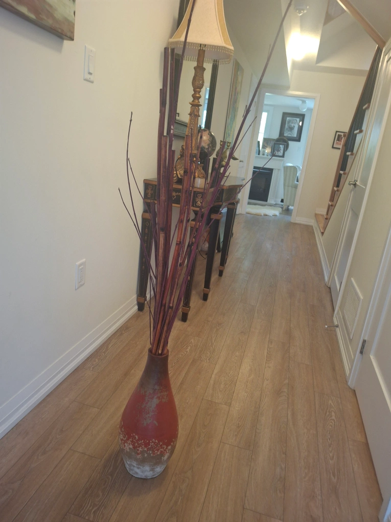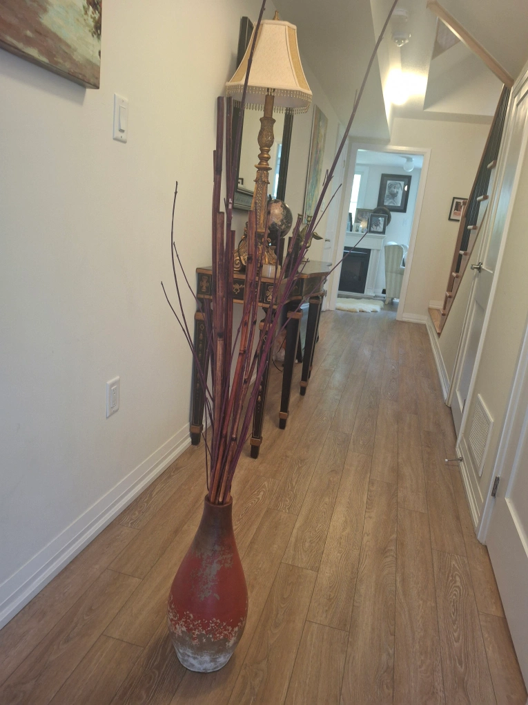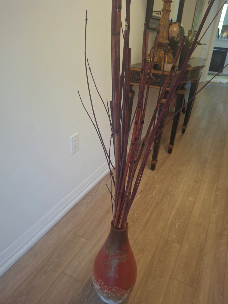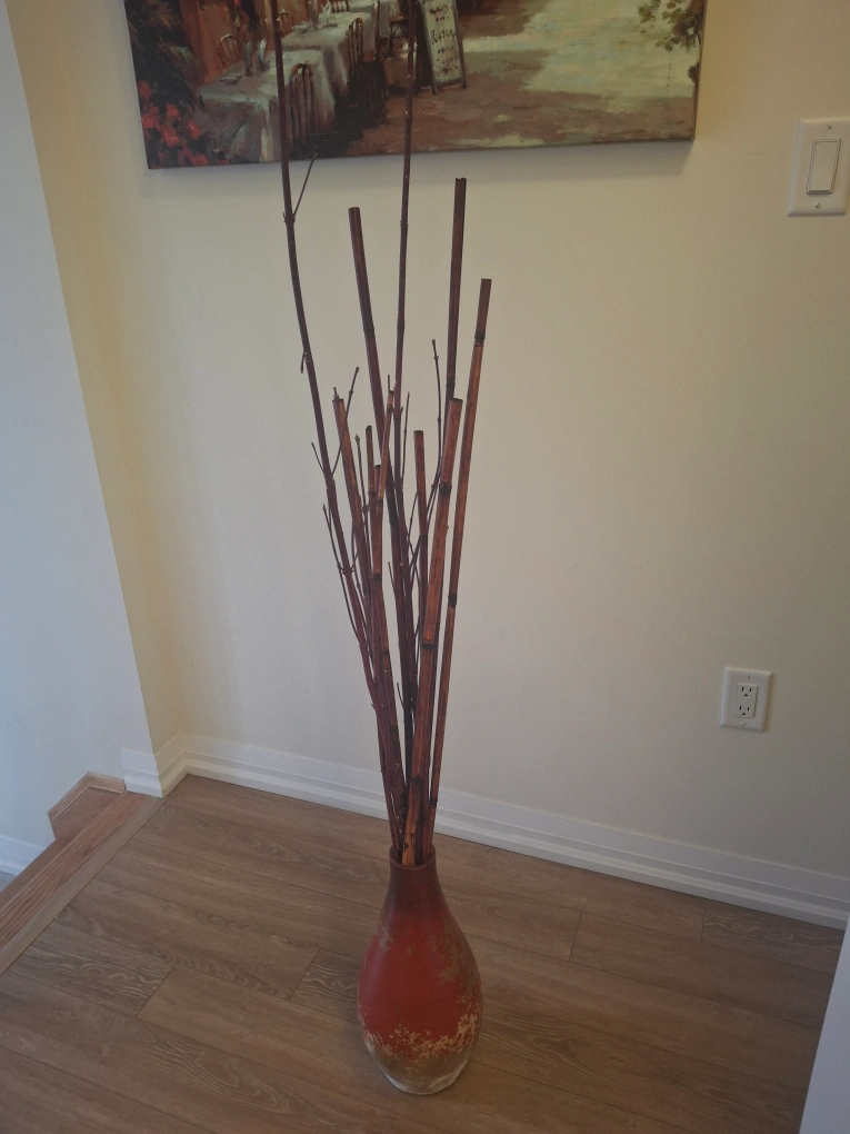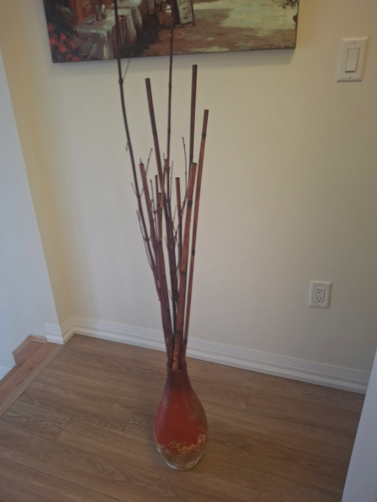 I'm selling a decorative vase with bamboo sticks. It's a great accent piece for any room. The vase has a unique design, and the bamboo sticks add a natural touch. It's in good condition and ready to find a new home!