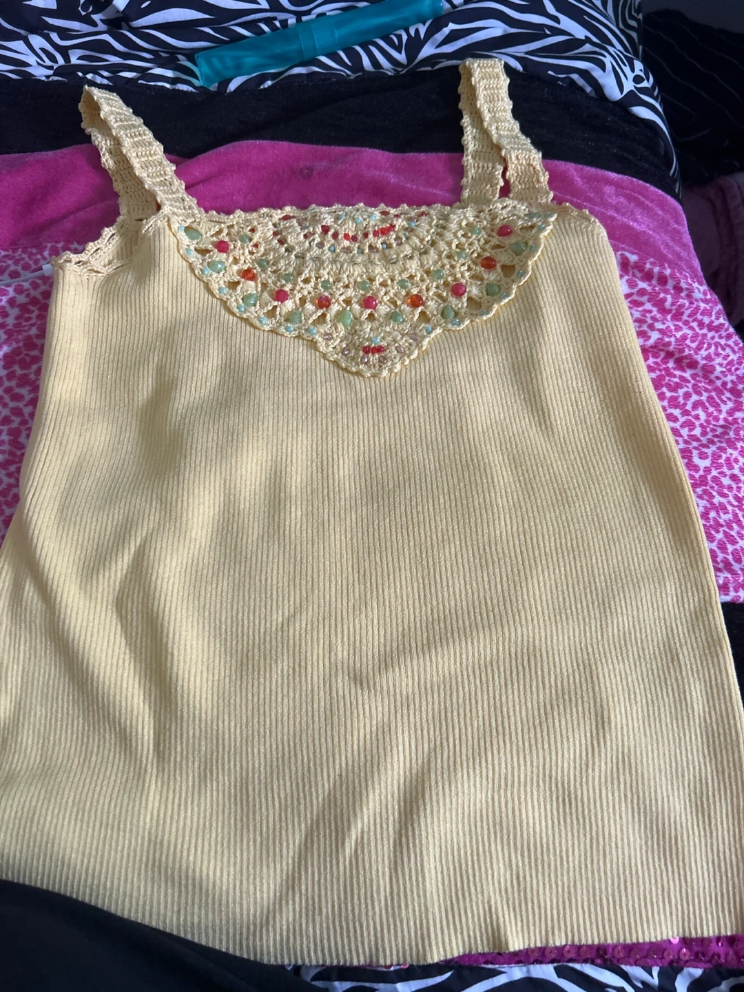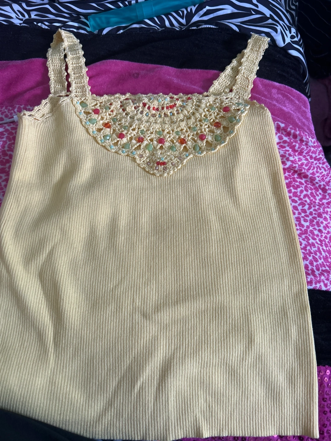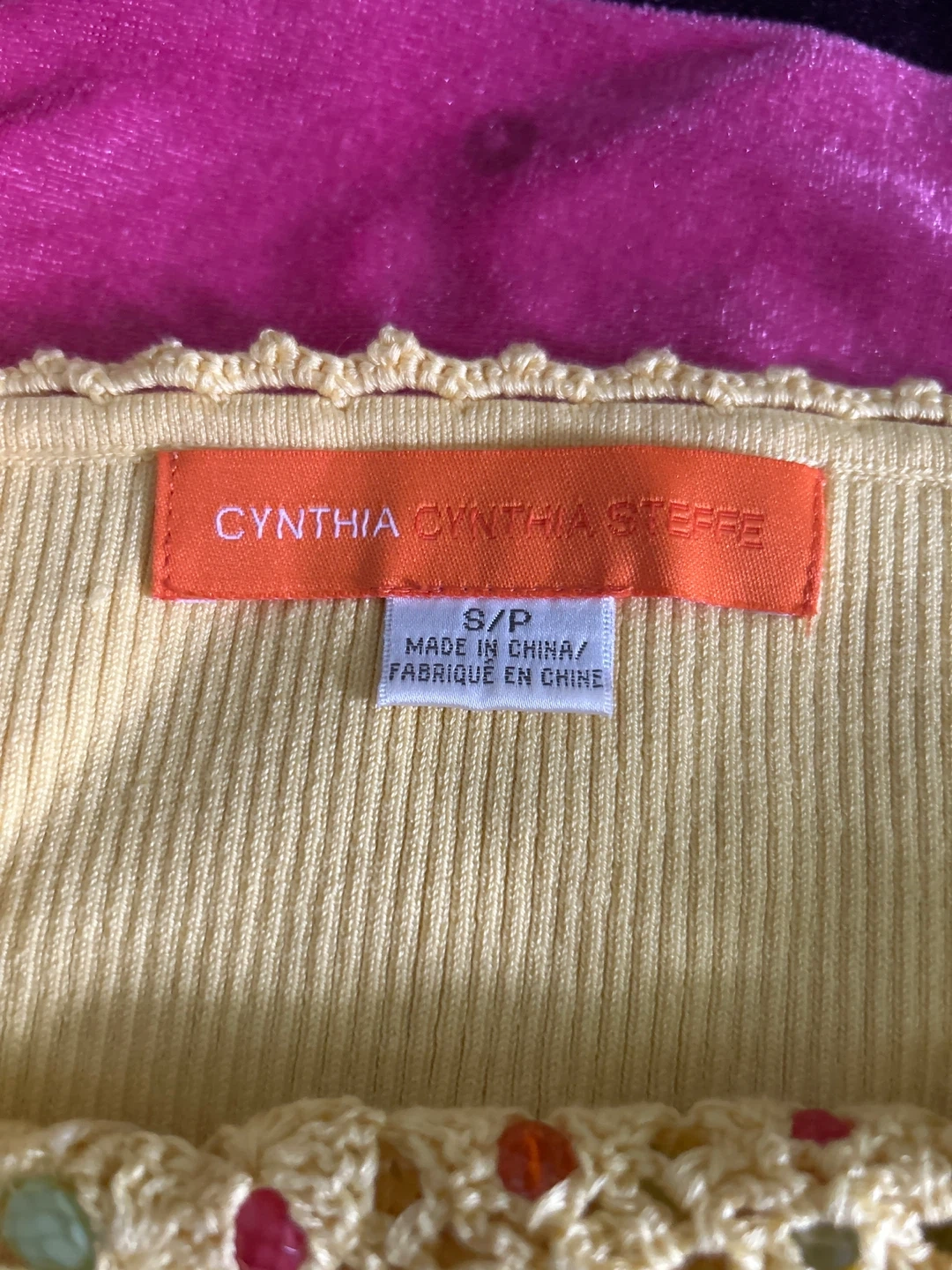 This is a cute yellow tank top from Cynthia Steffe! It has a lovely crocheted detail around the neckline with little beads. It's a size S/P and made in China. Perfect for summer!
