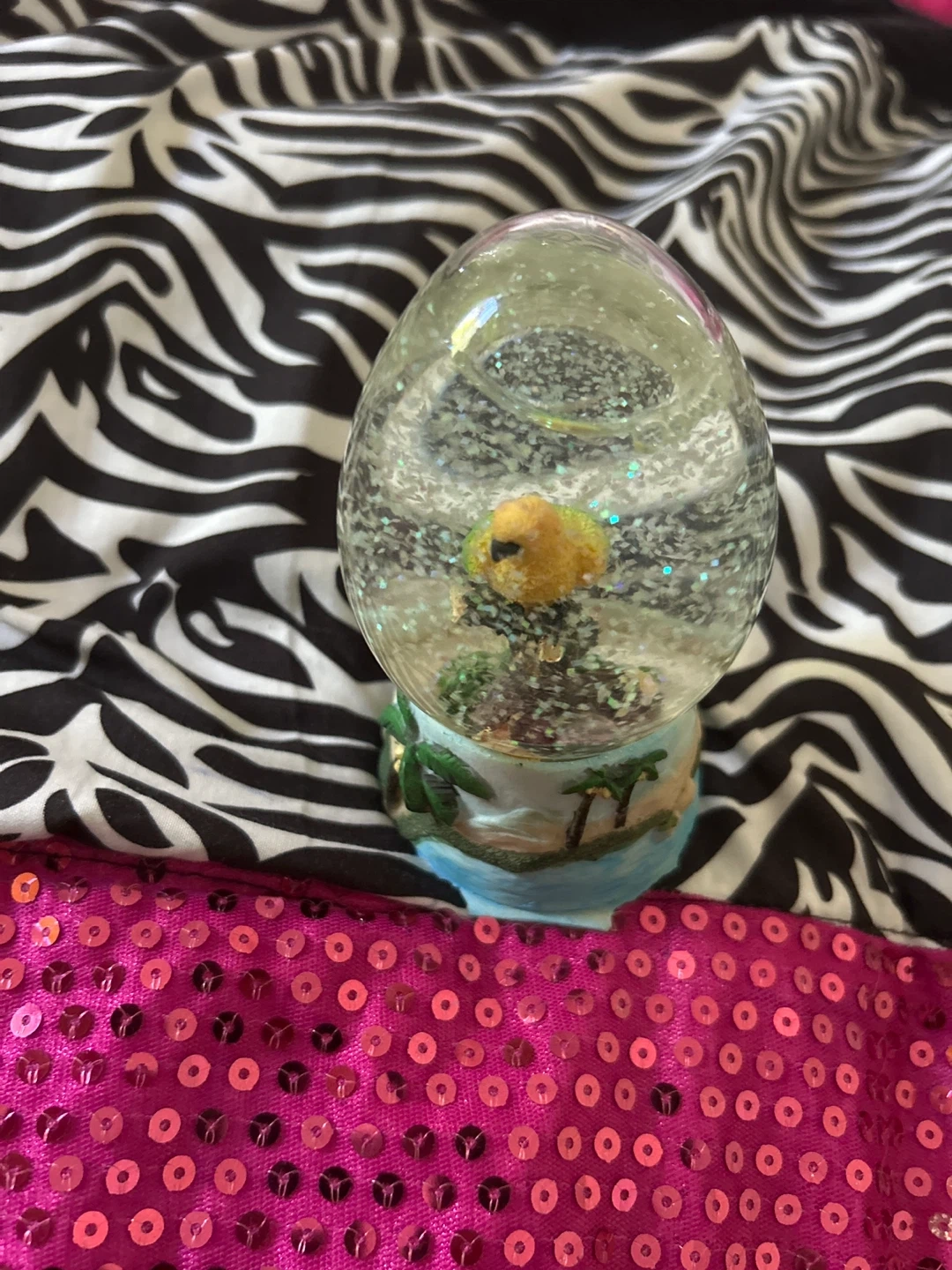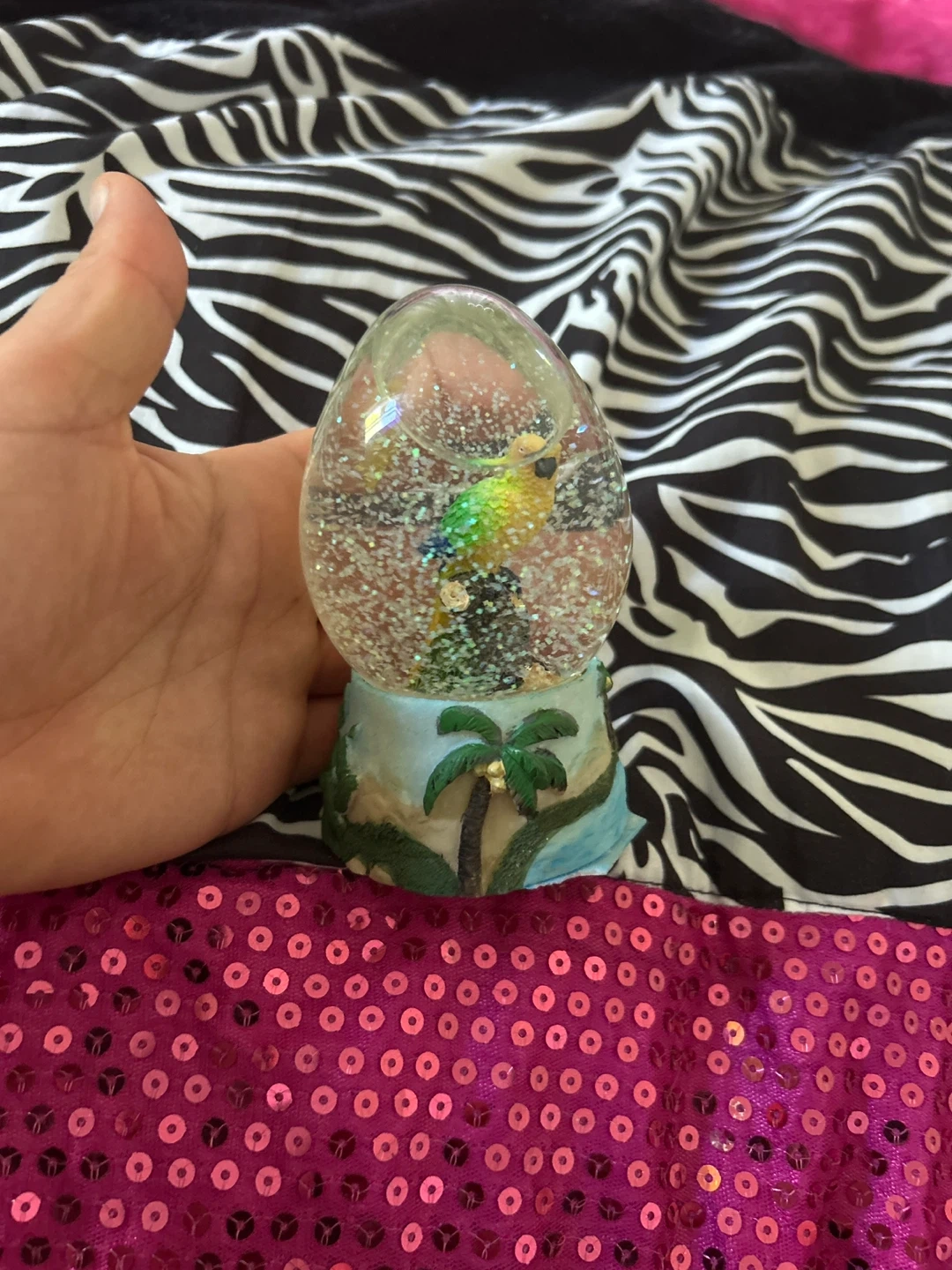 A cute tropical snow globe featuring palm trees and a colourful bird inside! It's in great condition and would look great on a shelf or desk