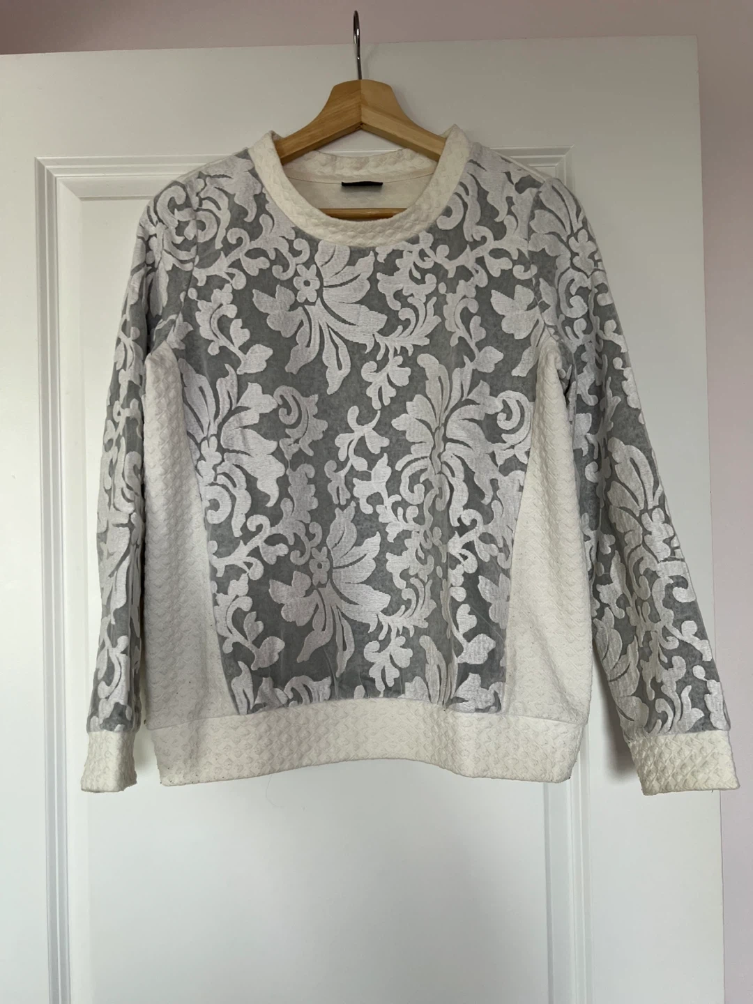 Selling a stylish sweater featuring unique floral sleeves. The body of the sweater has a textured pattern. It's in great condition and ready for a new home!