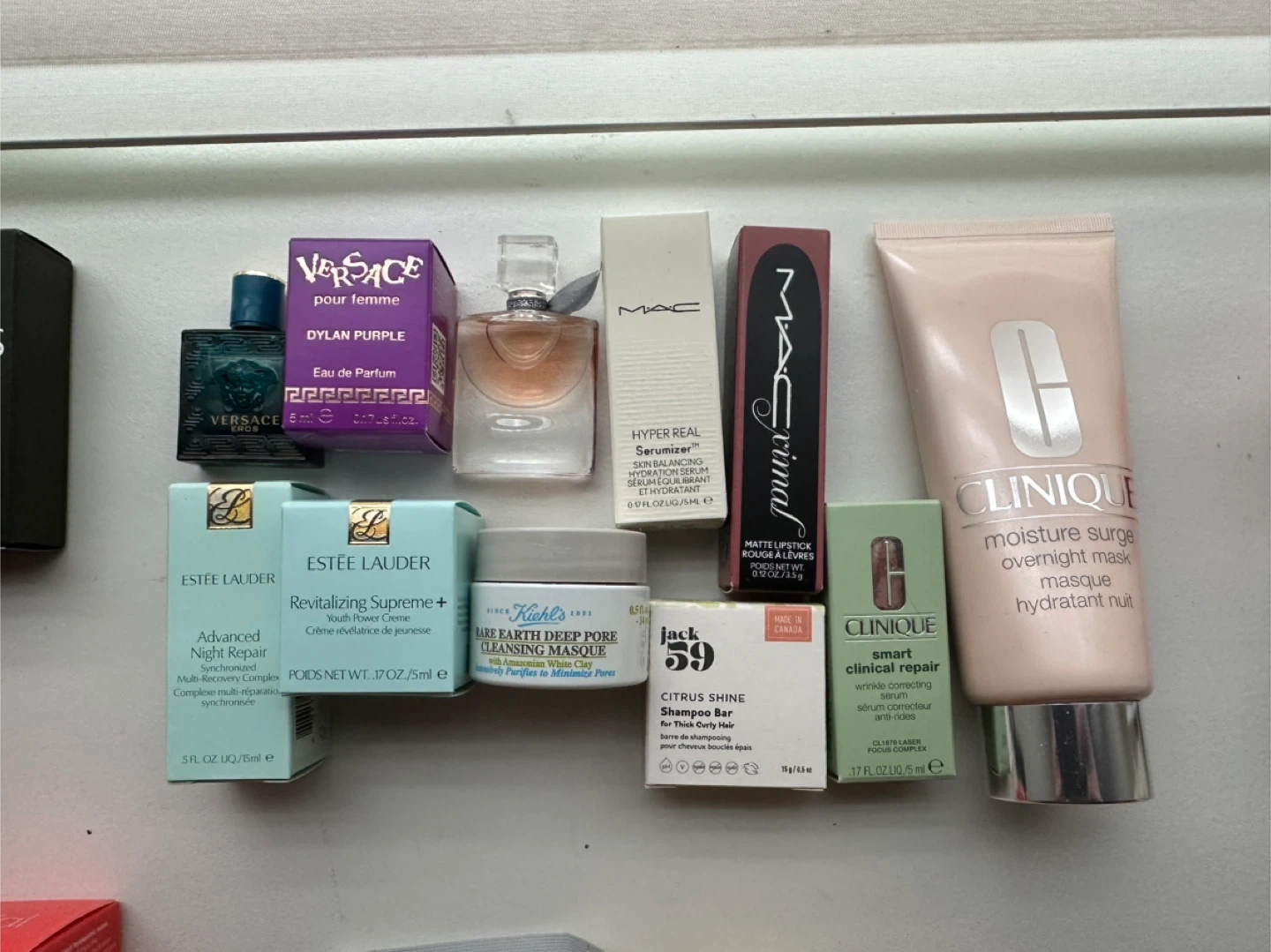 A wide selection of makeup and perfume from the last Hudson’s Bay advent calendar. All items are unopened. What’s included: -Shiseido Bio Performance Super Revitalizing Cream (18mL) -Chloé Signature Lumineuse Eau de Parfum Pen Spray (10mL) -VALENTINO Born in Roma Eau de Toilette Classic (6mL) -VALENTINO Born in Roma Green Stravaganza Uomo (15mL) -Origins Ginzing Energizing Gel Cream with Caffeine and Niacinamide (5mL) -Origins Checks and Balances Frothy Face Wash (15mL) -Lancome Absolue Revitalizing Eye Cream -Glasshouse Fragrances Kyoto in Bloom Candle (30g) -Ferragamo Signorina Libera Eau de Parfum Deluxe Replica Miniature (5mL) -Narciso Rodriguez For Her Eau de Parfum Purse Spray (10mL) -Hermès Terre d’Hermès, Pure Perfume (12.5mL) -Versace Dylan Purple Eau de Parfum (5mL) -Versace Eros Eau de Toilette Mini (5mL) -Estee Lauder Advanced Night Repair (15mL) -Estee Lauder The Power Pair Supreme Deluxe (5mL) -M.A.C M·A·CXIMAL Silky Matte Lipstick in Velvet Teddy (3.5g) -M.A.C Hyper Real Serumizer Skin Balancing Hydration Serum (5mL) -Clinique Smart Clinical Repair Serum (5mL) -Clinique Moisture Surge Overnight Mask (100mL) -Kiehl’s Rare Earth Mask (14mL) -Jack59 Citrus Shine Travel Buddy Shampoo Bar (15g) -FOREO LUNA™ Play Plus 2 -Elizabeth Arden Retinol + HPR Ceramide Capsules Rapid Skin Renewing Serum (30pc) -Egyptian Magic Balm (1oz) -Cartier Declaration Eau de Toilette (10mL) -Stripes Beauty The Crown Pleaser Hair Mask (50mL) -Graydon Skincare Supermoon Serum (30mL) -Rodial Dragon’s Blood Sculpting Gel (50mL) -Rodial Dragon’s Blood Hyaluronic Mask (50mL) -Three Ships Lip Treatment Kit (30mL) -Three Ships Brighter Days Eye Mask (1 pair) -Lise Watier Sublimessence High Brightening Vitamin C Serum (3mL) -Lise Watier Luminessence Glow-Boosting Day Cream (3mL) -Lise Watier Waterproof Eyeliner Brun Noir (0.8g) -Bobbi Brown Vitamin Enriched Eye Base (15ml)