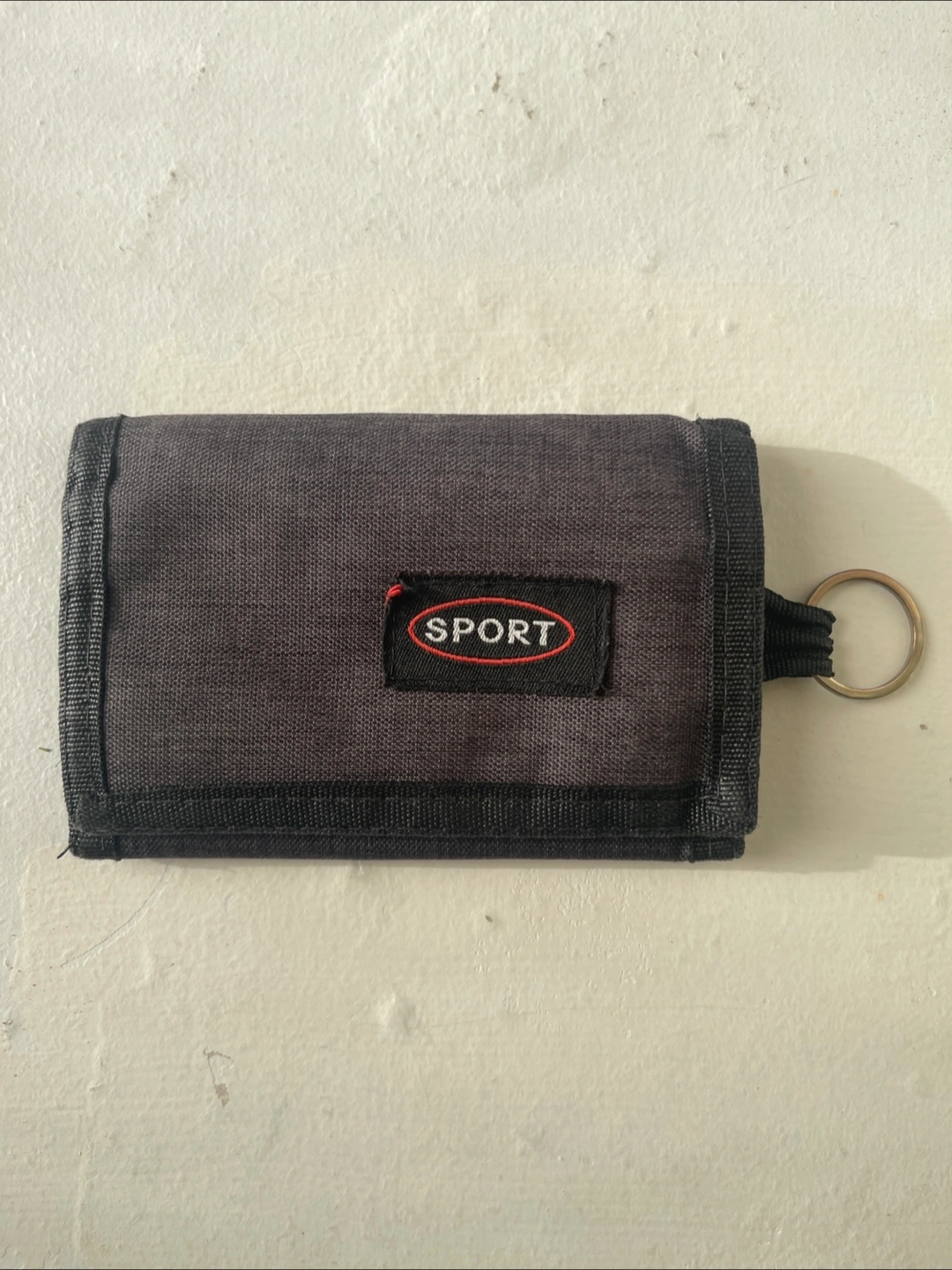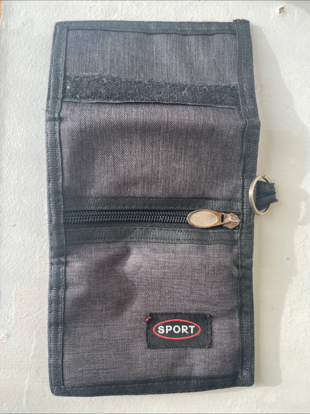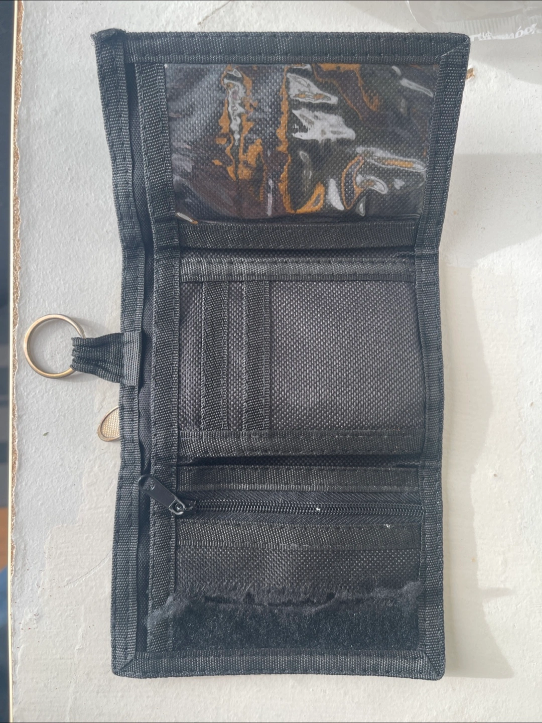 black wallet with a sporty design. It has a convenient tri-fold design with multiple compartments inside for cards and cash. Little torn on it.