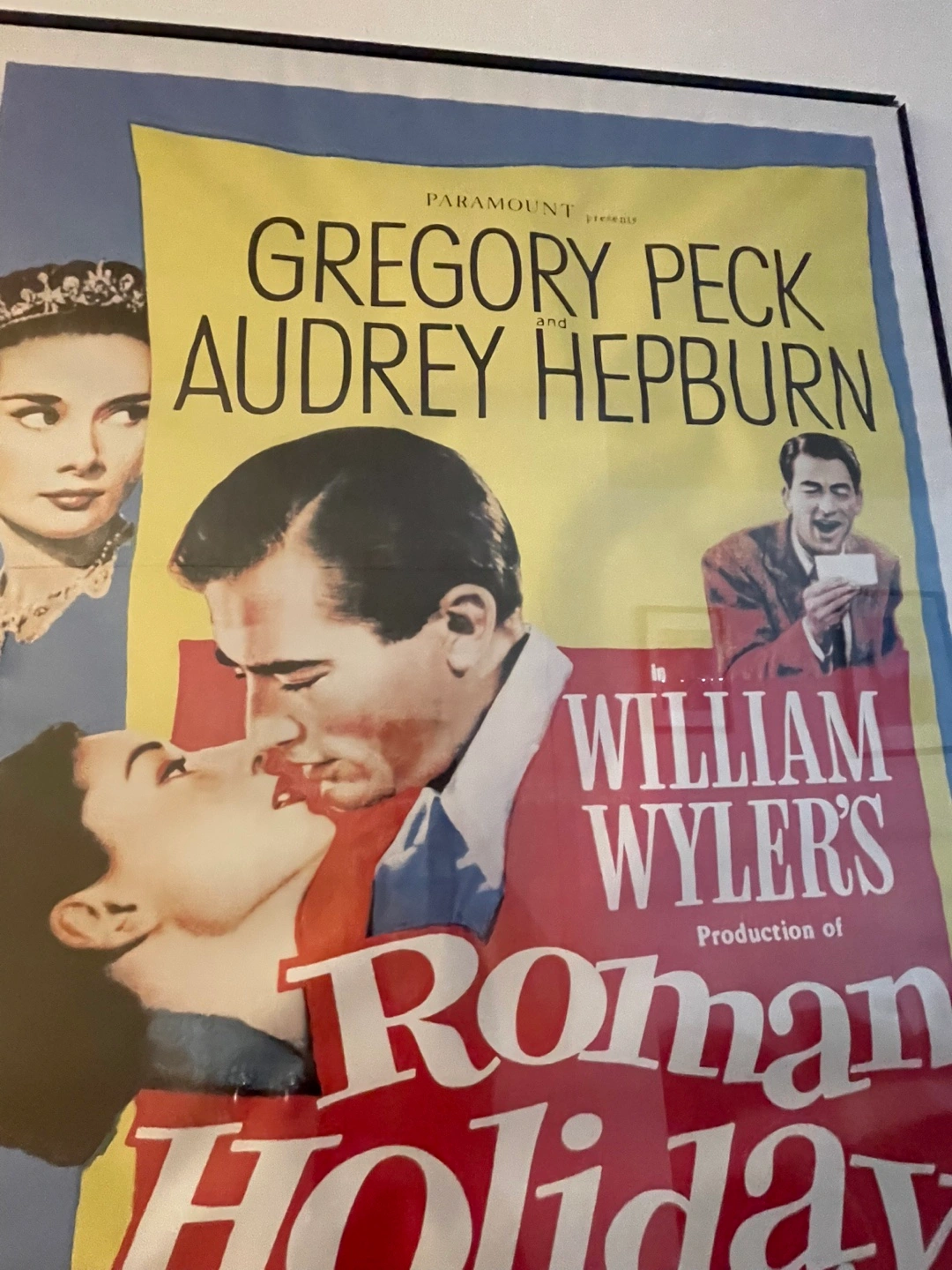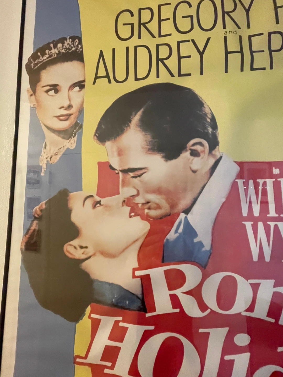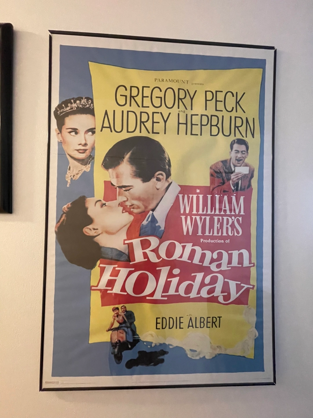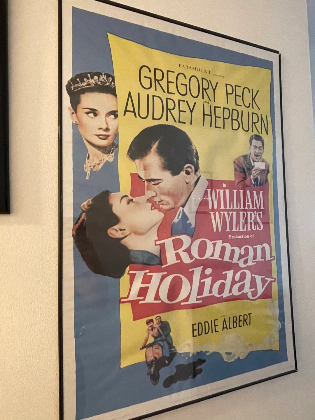 a framed movie poster for the classic film Roman Holiday, starring Gregory Peck and Audrey Hepburn. Gorgeous poster. Perfect for film buffs or Audrey fans. Great condition. Plastic frame with black border. Hook on the back to hang on the wall 36x 24 inches Pick up near Yonge and eglinton